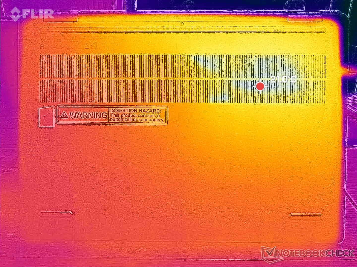 Die Oberflächentemperaturen sind auf der linken Seite des Systems am wärmsten, wo Hotspots sowohl auf der Ober- als auch auf der Unterseite 38 °C erreichen können. Das ist nur geringfügig kühler als bei dem teureren Galaxy Book4 Pro 16, welches mit dem viel schnelleren Core Ultra 7 155H ausgestattet ist.