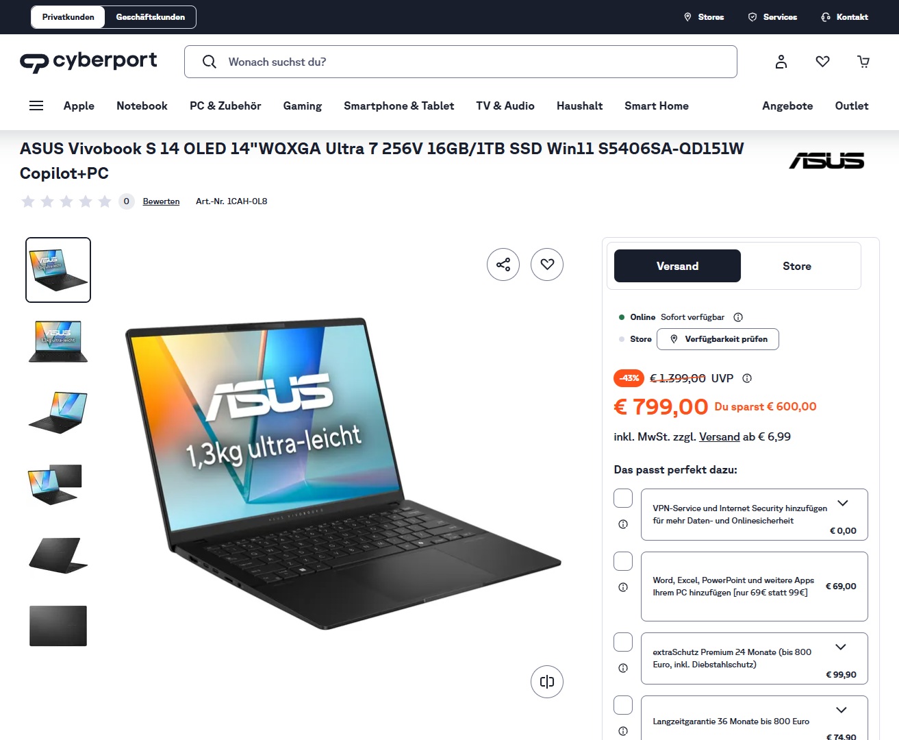 Die VivoBook-S14-Reihe der Firma Asus steht für leichte, mobile 14-Zoll-Notebooks, die mit viel Leistung aufwarten können. Asus nennt für den Rechner ein Gewicht von 1.300 Gramm. Aktuell führt Cyberport.de mit dem VivoBook S14 OLED S5406SA-QD151W einen Abkömmling der Serie zu einem Preis von 799 Euro im Sortiment. Ein Schwestermodell musste sich bereits unserem Test stellen und erreichte die Wertung „Gut (86 %)“.