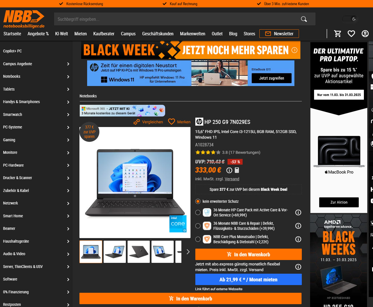 Einfache, recht preisgünstige Office-Laptops für private Anwender, Unternehmen und Organisationen hält die Firma Hewlett Packard innerhalb der 255/250-Reihe bereit. 255er-Modelle sind mit AMD APUs ausgestattet, 250er-Modelle haben Intel-Prozessoren an Bord. Aktuell führt Notebooksbilliger.de mit dem 250 G9 einen Intel-basierten Vertreter der Serie zu einem Preis von 333 Euro im Sortiment. Es handelt sich um eine bereits von uns getestete Ausstattungsvariante. Der Rechner ergatterte die Bewertung „Gut (75 %)“.