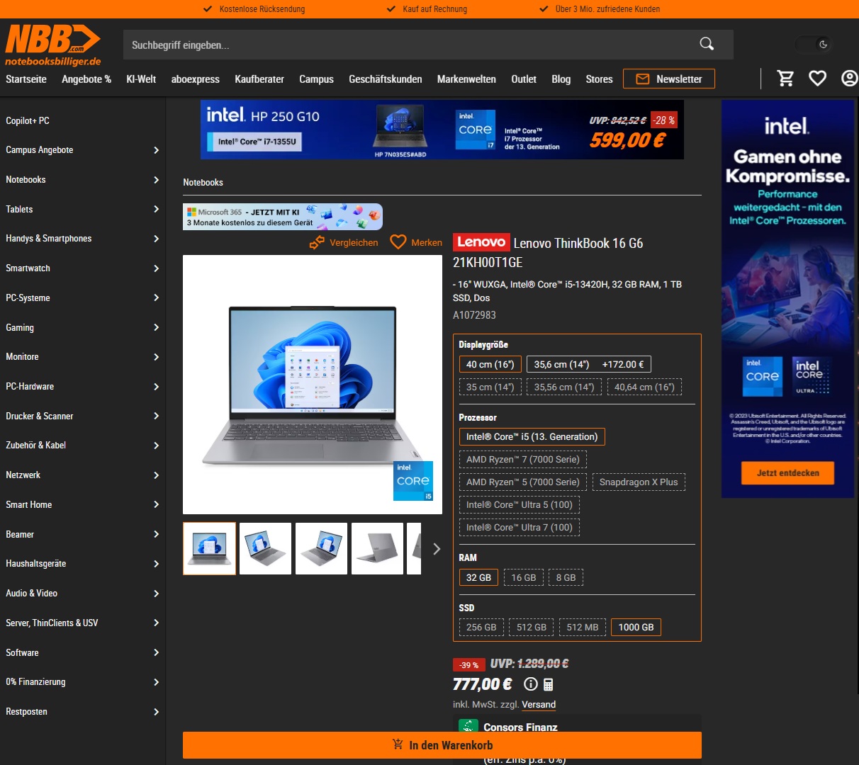Lenovo hält neben der bekannten ThinkPad-Familie noch eine zweite Linie von Business-Notebooks bereit, welche die Bezeichnung "ThinkBook" trägt. Letztere ist als preislich attraktivere Alternative zu sehen. Notebooksbilliger.de führt mit dem ThinkBook 16 G6 IRL 21KH00T1GE ein gut ausgestattetes, Intel-basiertes Modell (16 Zoll) der Reihe zu einem Angebotspreis von 777 Euro im Sortiment. Ein äußerlich baugleiches AMD-Schwestermodell absolvierte unseren Test mit der Note „Gut (86 %)“.