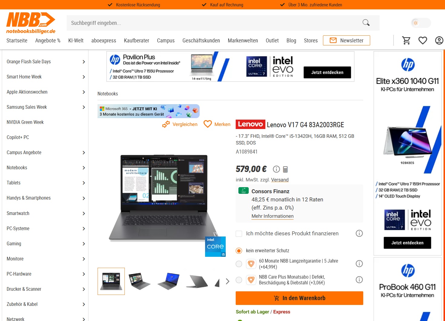Die Notebooks der V-Serie zählen innerhalb des Lenovo-Portfolios zum Business-Bereich, richten sich aber gleichermaßen an berufliche wie private Kunden. Aktuell führt Notebooksbilliger.de mit dem V17 G4 IRU 83A2003RGE ein 17,3-Zoll-Modell der Reihe zu einem Angebotspreis von 579 Euro im Sortiment. Ein leistungsschwächeres Schwestermodell absolvierte unseren Test mit der Wertung „Gut (77 %)“.