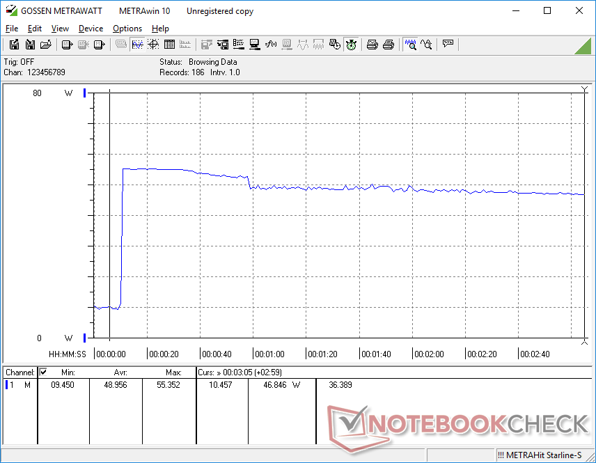 Wir konnten eine maximale Leistungsaufnahme von 56 W aus dem kleinen (~10,8 x 4,7 x 3 cm) 65-W-USB-C-Netzteil aufzeichnen, wenn wir Prime95 Stress anlegen, wie unsere Screenshots unten zeigen. Dies ist niedriger als die 63 W, die wir bei der Core i5-1250P-Konfiguration gemessen haben, da letztere von einer höheren anfänglichen Turbo-Boost-Leistung profitiert, wie in unseren CineBench-Ergebnissen oben zu sehen ist.