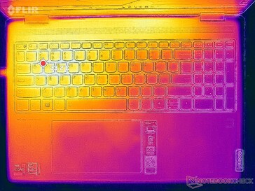 Das 2-in-1-Notebook wird auf der linken Seite deutlich wärmer als auf der rechten Seite. Dies ist vermutlich auch auf die Positionierung des Kühlsystems zurückzuführen. Mit Hotspots von 33 °C zwischen den Tasten wird das Lenovo Yoga aber nicht so warm wie beispielsweise das Samsung Galaxy Book3 Pro 360 oder das Dell Inspiron 16 7620, die beide Oberflächentemperaturen von über 40 °C erreichen. Nur das Convertible von Lenovo lässt sich daher auch im Tablet-Modus immer angenehm halten.