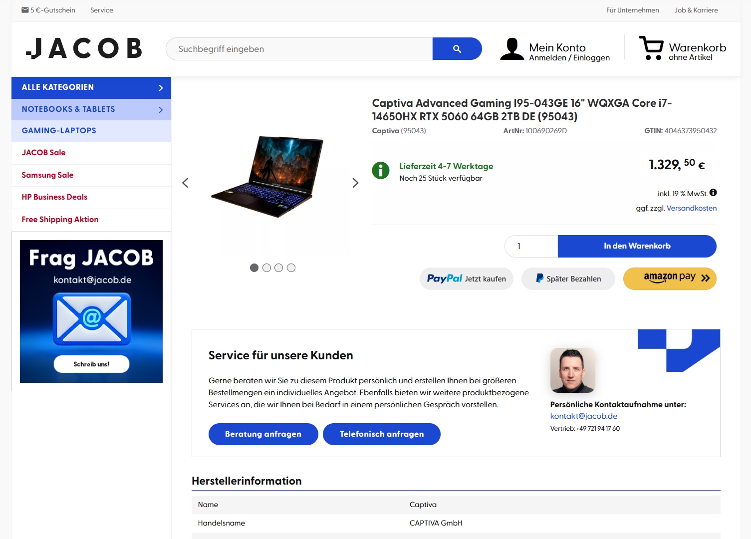 Captiva hält mit dem Advanced Gaming I95-043GE ein gut ausgestattetes Gaming-Notebook der Mittelklasse bereit. Aktuell führt Jacob.de den Rechner zu einem Angebotspreis von 1.329,50 Euro im Sortiment. Die Hardware des Laptops ist auf 2.5k-Gaming bei hohen Settings ausgelegt. Einem unserer Tests musste sich der Rechner noch nicht stellen.