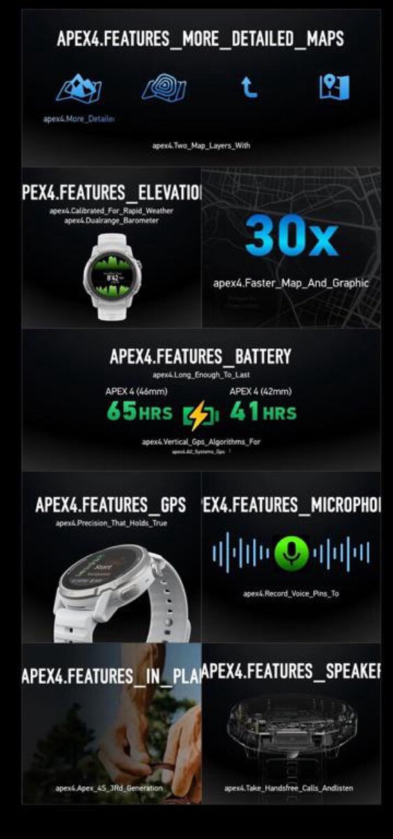 Laut eines Promo-Bilds erreicht die Coros Apex 4 eine 30 Mal höhere Performance bei der Nutzung von Karten und bei der Darstellung von Grafiken, während Karten zeitgleich mehr Daten als bisher enthalten sollen. Coros verbaut angeblich ein verbessertes "Dual-Range Barometer", um die Höhe akkurater zu bestimmen, und in Verbindung mit dem GPS-Modul die Position des Nutzers noch präziser zu bestimmen.