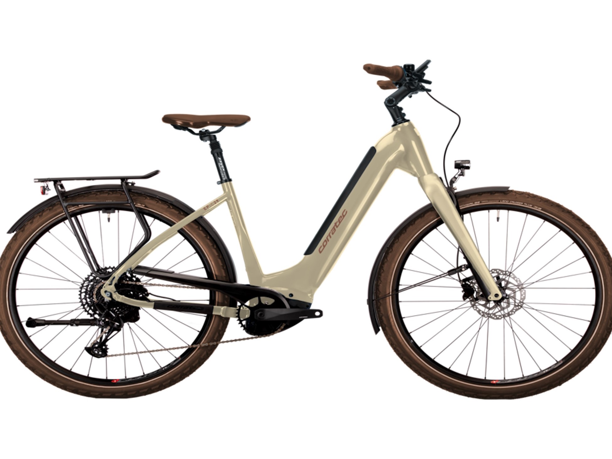 Das Corratec E-Power C29 CX8 Wave nutzt keine Federgabel, sondern eine Starrgabel, was durchaus Einschränkungen beim Fahrkomfort bedeuten - und zwar nicht nur im Gelände, sondern etwa auf Kopfsteinpflaster. Vorne und hinten sind 55-622-Reifen vom Typ Continental Contact Cruiser aufgezogen, wobei diese in einem braunen Farbton kommen und in Kombination mit dem farbigem und aus Aluminium gefertigten Rahmen durchaus eine nicht ganz unauffällige Optik bieten. Der Tiefeinsteiger kommt mit einem Gepäckträger und Schutzblechen, eine Beleuchtung ist vorhanden. Vorne und hinten nutzt Corratec beim E-Power C29 CX8 Wave HD-T275-Bremsen von Tektro, vorne wirkt die hydraulische Scheibenbremse auf eine 180 Millimeter große Bremsscheibe, hinten ist diese 160 Millimeter groß. Angegeben wird ein Preis von 5.399 Euro.