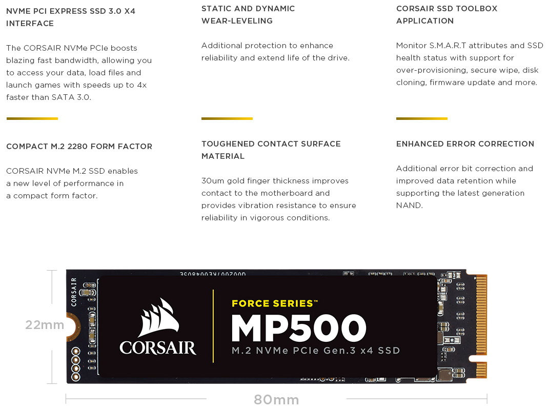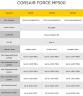 Die wichtigsten technischen Daten der Corsair Force MP500 M.2 NVMe PCIe SSD (Herstellerangaben):