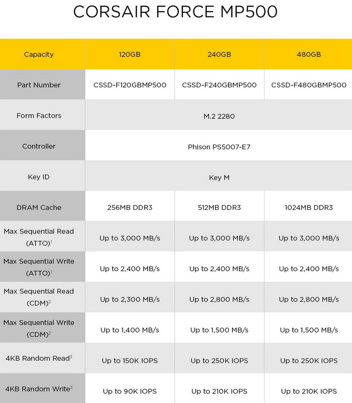 Die SSDs der MP500-Reihe sind mit einem Phison PS5007-E7 NVMe-Controller und einer PCIe Gen. 3 x4 M.2-2280-Schnittstelle mit hoher Bandbreite ausgestattet. Corsair nennt Lesegeschwindigkeiten von bis zu 3.000 MB/s und Schreibgeschwindigkeiten von bis zu 2.400 MB/s. Zudem verfüg die MP500-Serie über SmartECC, SmartRefresh und SmartFlush, um beispielsweise die Daten vor Beschädigungen im Falle eines unerwarteten Stromausfalls zu schützen.