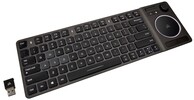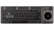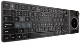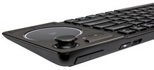 Als Besonderheiten integriert das Wireless Keyboard Corsair K83 an der rechten Seite einen analogen Joystick, der die Bedienung von Menüs und das Durchsuchen von Inhalten erleichtern soll und ein rundes 4-Finger-Gesten-Touchpad. Im Gaming-Modus lassen sich über den Joystick zusammen mit den WASD-Tasten und den beiden Maustasten auch Spiele steuern. Links neben dem Joystick hat Corsair in die K83 einen Lautstärkeregler als Rolle mit Press-to-Mute-Funktion integriert. Darunter sind die Taste für die Hintergrundbeleuchtung und die FN-Sperrtaste platziert.