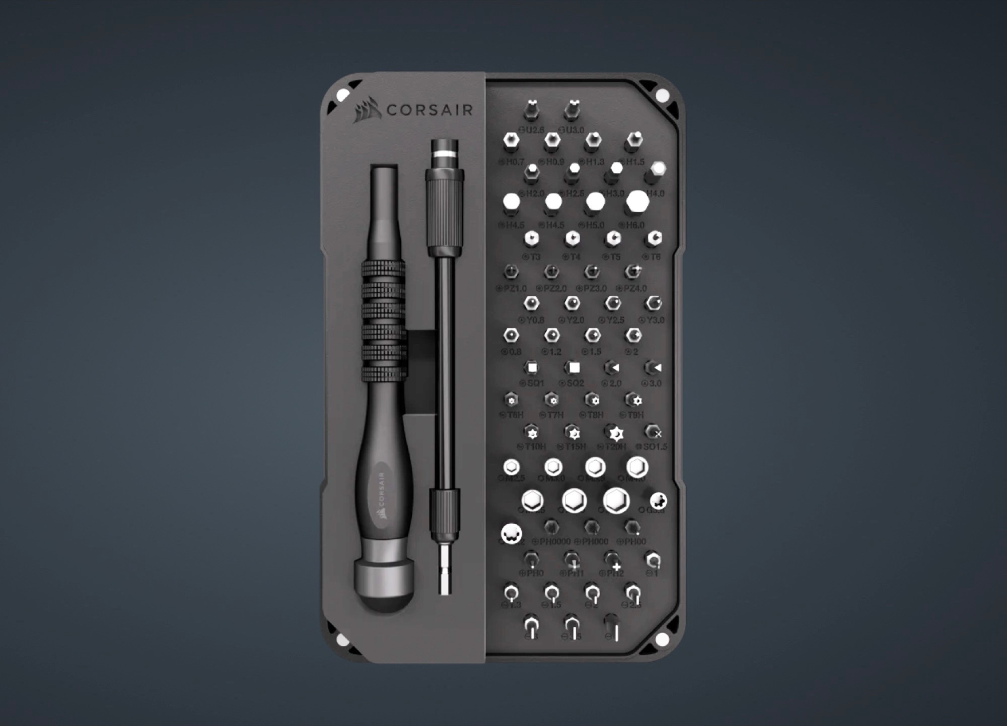 Das Corsair PC DIY Präzisions-Toolkit soll PC-Enthusiasten das mühsame Zusammenstellen passender Werkzeuge erleichtern, indem ein Schraubendreher mit 65 Bits kombiniert wird, die beim Aufschrauben von Computern und Zubehör am häufigsten benötigt werden. Eine biegbare Verlängerungswelle erleichtert es, an schwer zugängliche Schrauben zu gelangen.