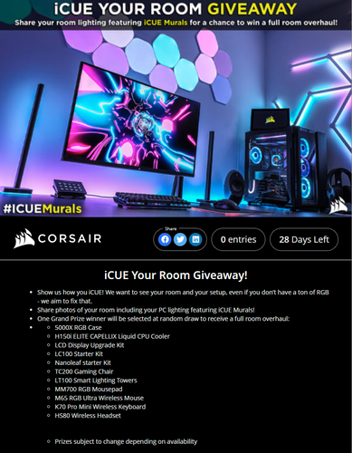 Corsair veranstaltet zum Launch von iCue Murals Lighting auch ein Gewinnspiel. Wer mitmacht und sein persönliches Lichtsetting mit der Corsair-Community teilt, der hat die Chance auf eine komplette Raumbeleuchtung mit kompletten RGB-Gaming-Beleuchtung und Corsair TC200 Gaming-Stuhl.