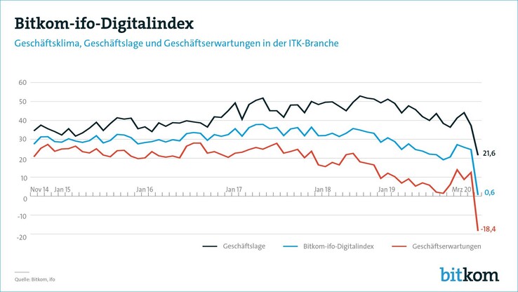 Das sind die Ergebnisse der monatlichen Konjunkturumfrage von Bitkom und dem ifo-Institut in der ITK-Branche. Der Bitkom-ifo-Digitalindex, der sich aus der Einschätzung von Geschäftslage und Geschäftserwartung berechnet, notiert aktuell nur noch bei 0,6 Punkten. Im Februar lag dieser noch bei 24,6 Punkten. Das sei der niedrigste Wert seit dem Höhepunkt der Finanzkrise im Jahr 2009, so der Bitkom. Die Mehrheit der Firmen in Deutschland rechnet für die kommenden 6 Monate mit einer weiteren Verschlechterung der Geschäftslage. Das ist der stärkste Rückgang innerhalb eines Monats seit der erstmaligen Erhebung im Jahr 2006.