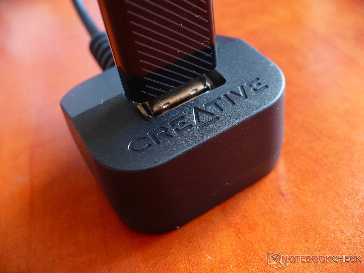 Ich möchte noch auf ein kleines Designdetail an der Seite der Kopfhörer eingehen. Dieses besteht nur aus ein paar Streifen, nichts Großartiges, aber Creative war aufmerksam genug, das gleiche Muster auch am USB-Dongle anzubringen, was nett aussieht. Außerdem gibt es zwei RGB-Leuchtringe, welche das SXFI THEATER besser aussehen und finden lassen, vor allem im Dunkeln. Sie sind aber auch nützlich, so zeigen sie zum Beispiel den Akkustand oder den Verbindungsstatus an, ohne dass man erst eine App checken muss.