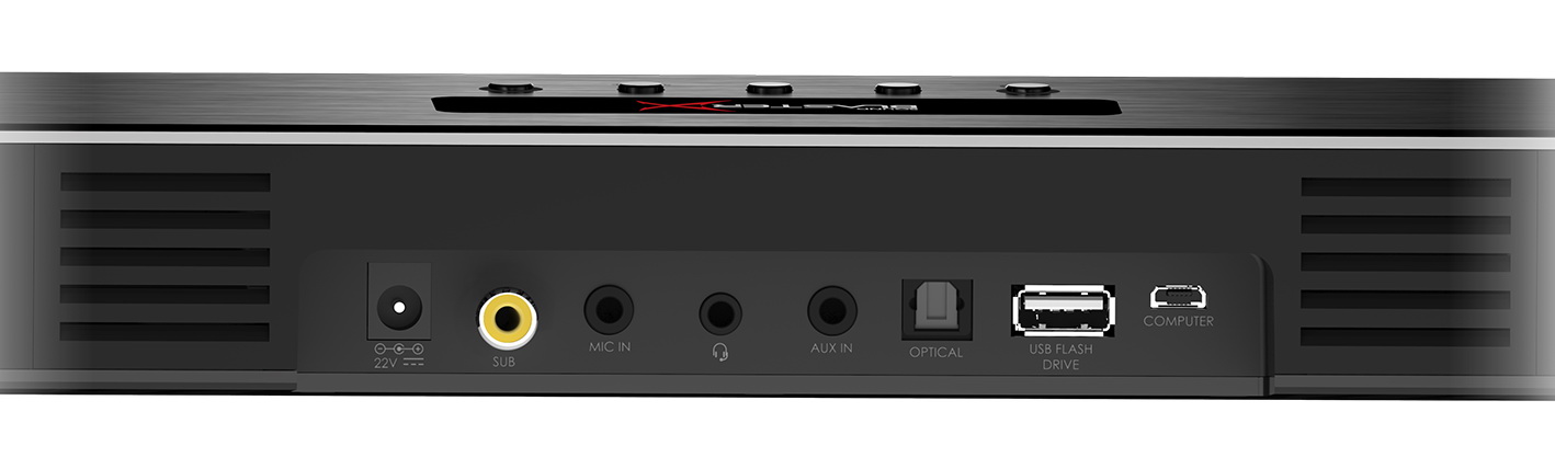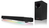 Die Creative Sound BlasterX Katana Soundbar selbst kommt im stylischen Design mit Abmessungen von 600 x 79 x 60 Millimetern, einem Gewicht von 1,5 Kilogramm und zwei integrierten nach vorne gerichteten Hochtönern (2x 1,3 Zoll) und nach oben abstrahlenden Mittelbasstreibern (2x 2,5 Zoll) sowie einer einstellbaren LED-Beleuchtung daher. Der separate Subwoofer misst 333 x 299 x 130 Millimeter, bringt es auf 4 Kilo und ist mit einem 5,25-Zoll-Treiber bestückt. Die Gesamtleistung der Bluetooth-4.2-Soundbar beziffert Creative mit 75 Watt RMS.