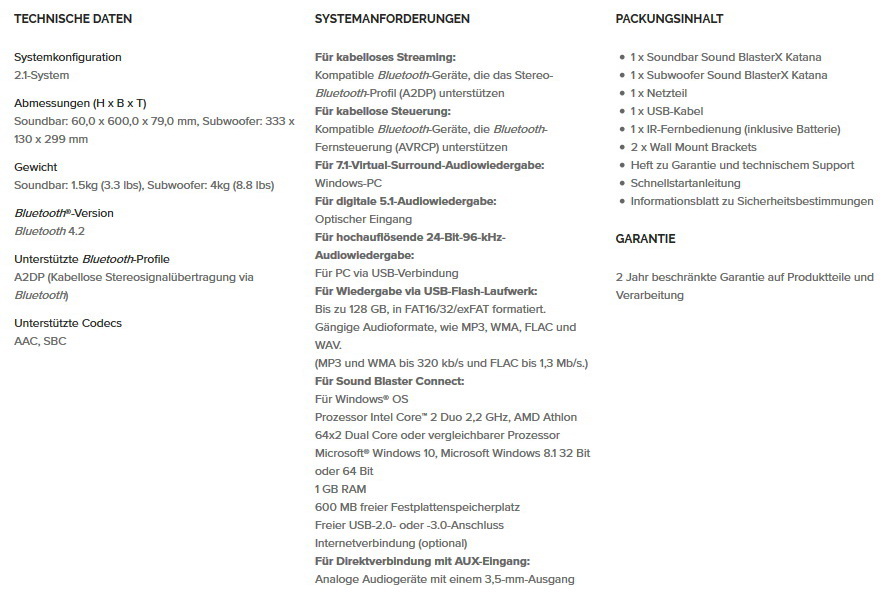 Ab März ist das Sound BlasterX Katana Soundsystem dann auch bei anderen deutschen Fachhändlern verfügbar. Die unverbindliche Preisempfehlung liegt bei rund 300 Euro. Caseking bietet aktuell vier Bundles der Sound BlasterX Katana an, solange der Vorrat reicht: