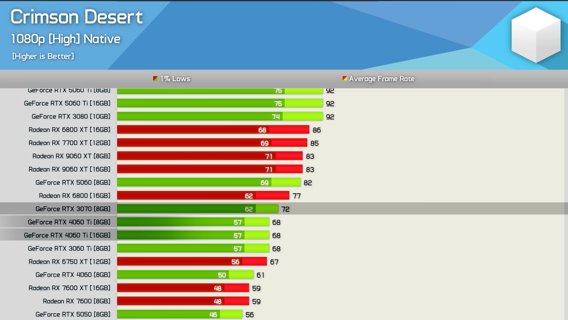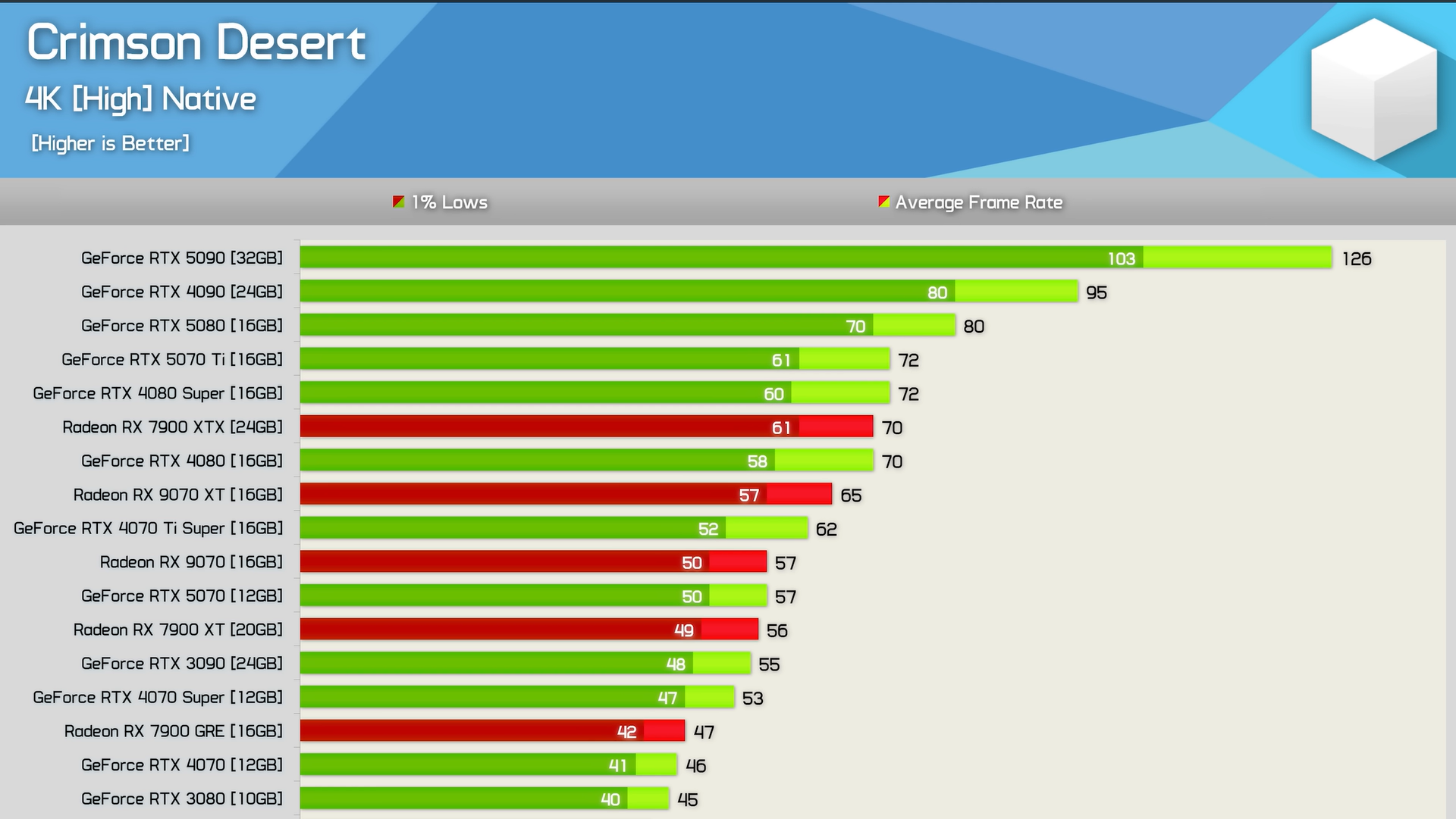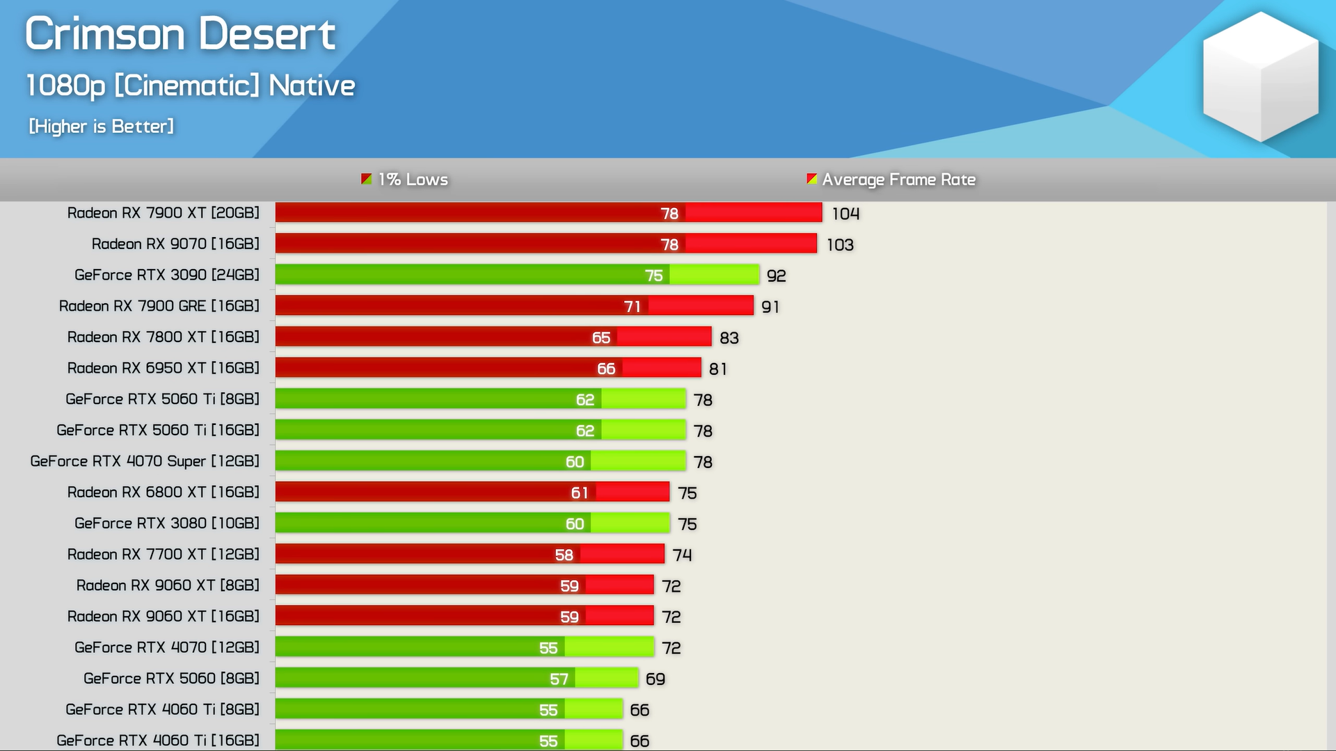 Hardware Unboxed hat die Performance von Crimson Desert mit 40 verschiedenen Grafikkarten und einem Ryzen 7 9800X3D gemessen. Die Ergebnisse sprechen für sich: Das Spiel läuft selbst auf Mittelklasse-Karten wie der RX 7600 stabil mit 60 FPS.