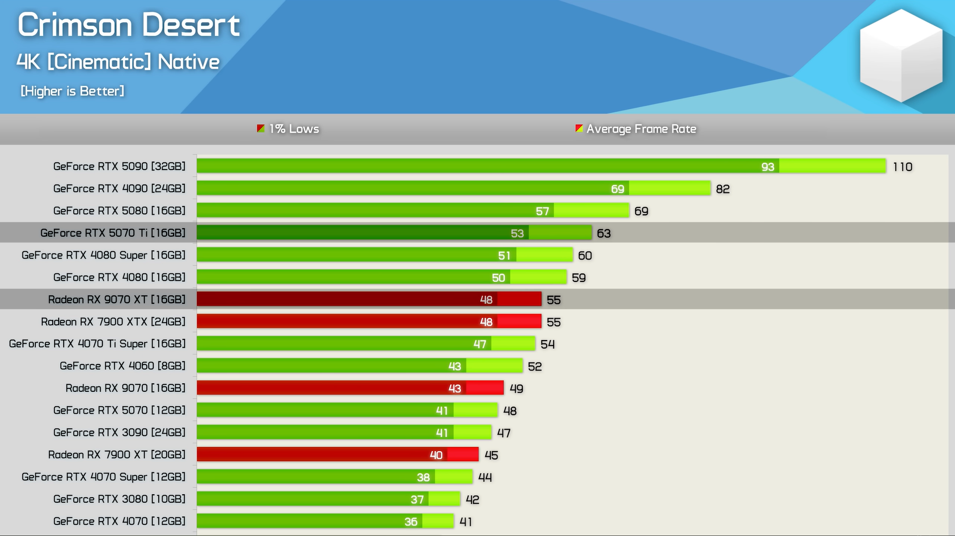 Interessanterweise schneiden GeForce-RTX-Karten in Crimson Desert besser ab als ihre Radeon-Gegenstücke. So ist die RTX 5070 Ti, die eigentlich eine langsamere GPU als die RX 9070 XT ist, in verschiedenen Auflösungen etwa 13 % schneller als das AMD-Pendant. Es ist jedoch zu erwarten, dass sich die Leistung durch Post-Launch-Patches noch verbessert.
