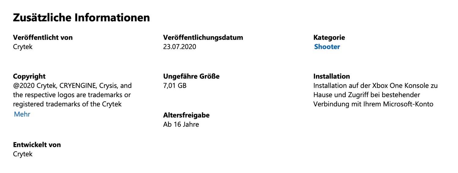 Das Veröffentlichungsdatum wird mit dem 23. Juli 2020 angegeben, wer den Titel im Microsoft Store vorbestellt soll allerdings zwei Tage früher Zugriff auf das Spiel erhalten. Mit gerade mal 7,01 GB ist die Download-Größe von Crysis Remastered im Vergleich zu vielen heutigen Titel geradezu winzig, die ursprüngliche Version für die Xbox 360 hat 4,09 GB benötigt. So wird das Spiel im Store beschrieben: