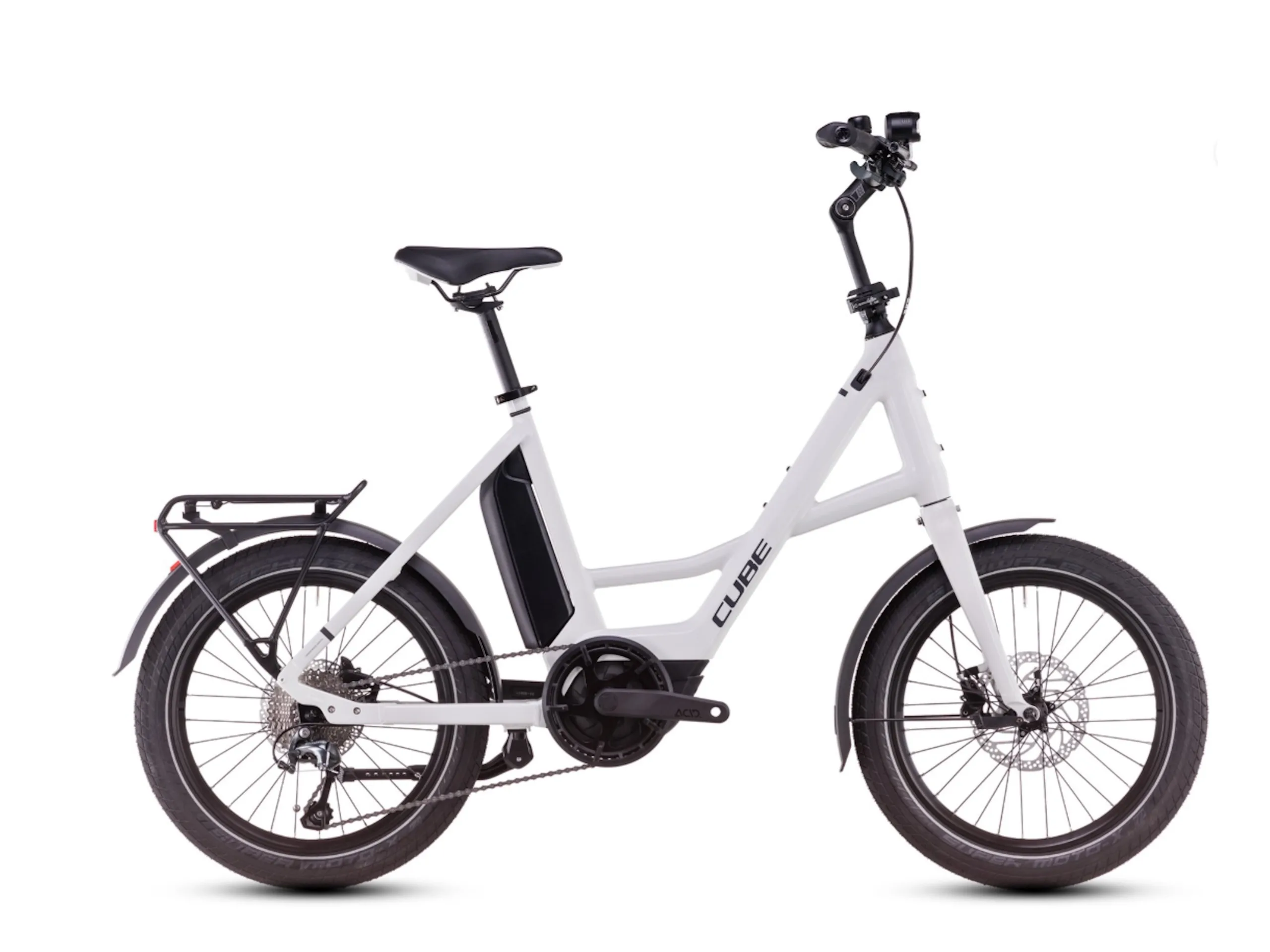 Das 22,8 Kilogramm schwere Fahrrad bringt vorne und hinten 20 Zoll große Reifen mit, dabei nutzt Cube Schwalbe Super Moto-X-Reifen mit einer Breite von 2,4 Zoll. Da es sich nicht um ein Klappfahrrad handelt, dürfte das Cube Compact Hybrid im öffentlichen Verkehr im Regelfall nicht kostenfrei als Gepäck mitgenommen werden können. Der Tiefeinsteiger bringt eine vollständige Ausstattung mit: So sind Schutzbleche ebenso vorhanden wie eine Beleuchtung und auch ein Gepäckträger fehlt nicht. Der Gepäckträger erlaubt die Nutzung von Packtaschen. Vorne und hinten stehen BR-MT200-Bremsen von Shimano bereit, die hydraulischen Scheibenbremsen wirken auf 180 und 160 Millimeter große Bremsscheiben. Eine klassische Kettenschaltung mit neun Gängen steht bereit. Eine Federung fehlt komplett, was etwa auf Kopfsteinpflaster durchaus problematisch sein kann.