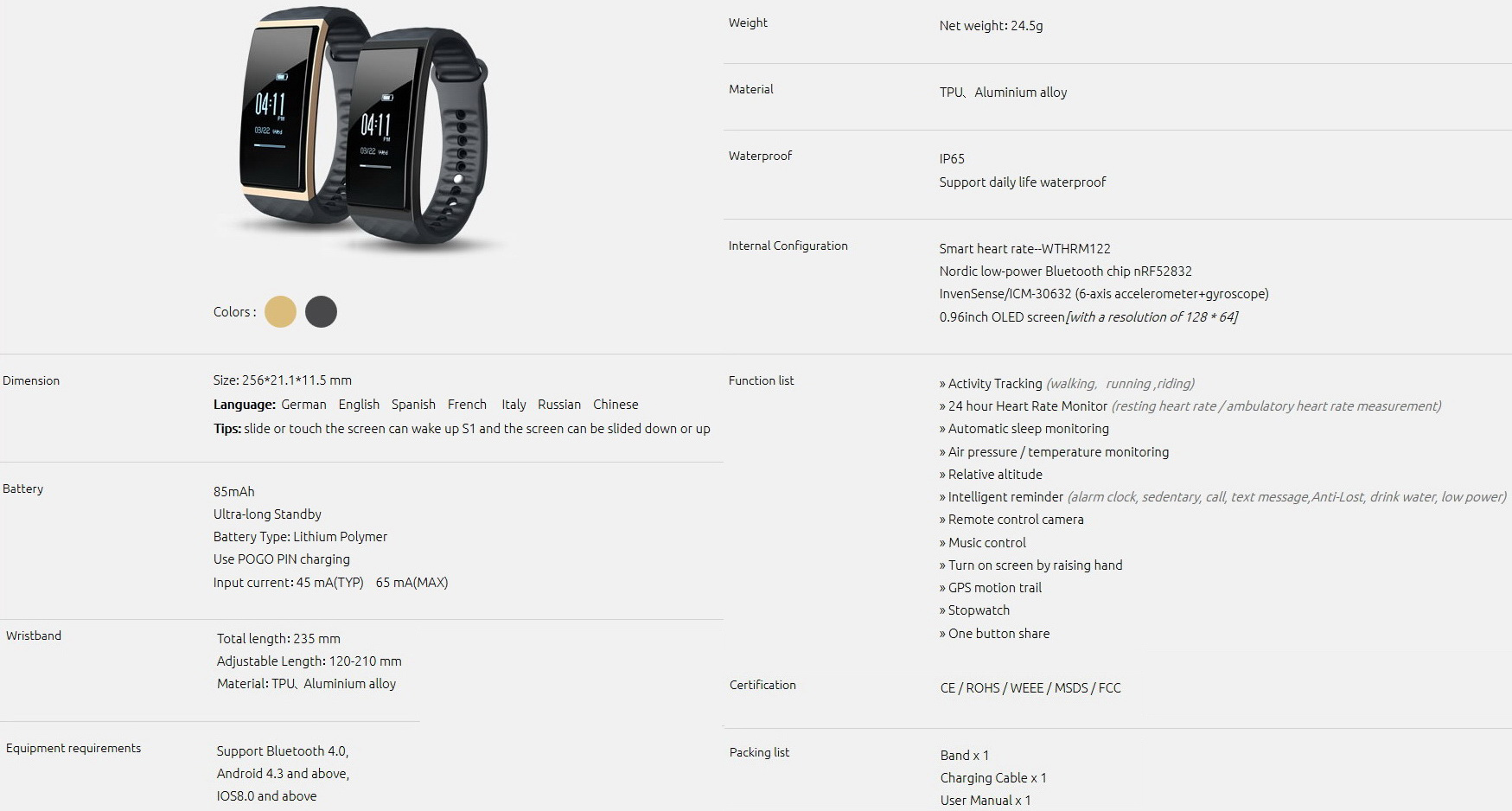 Zur Energieversorgung nutzt das Fitnessarmband Cubot S1 einen Lithium-Polymer-Akku mit einer Kapazität von 85 mAh. Geladen wird über ein mitgeliefertes USB-und-Pogo-Pin-Kabel. In nur 30 Minuten soll der Fitnesstracker für eine Betriebszeit von bis zu 30 Tagen aufgeladen sein. Als Farben für das Gehäuse stehen ein dunkles Grau sowie Gold zur Verfügung. Alle Akitvitäts- und Fintessdaten werden über die Cubot Band App für Android oder iOS ausgewertet und verwaltet.