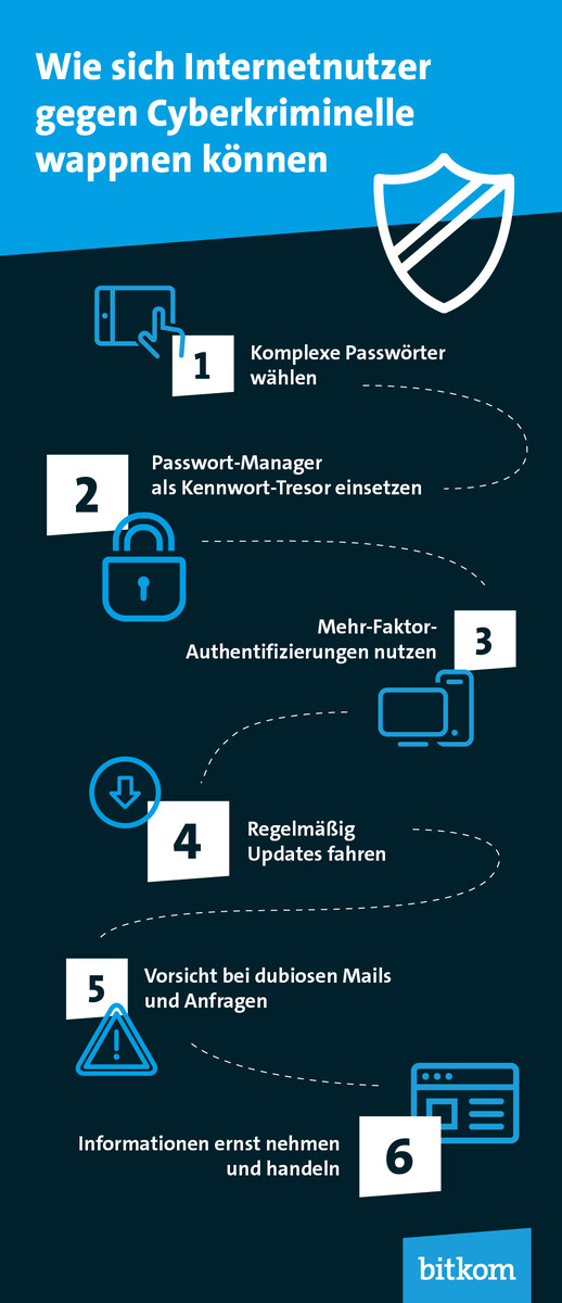 Fast die Hälfte der Bundesbürger (48 Prozent) haben sich in diesem Jahr über das Internet ein Schadprogramm auf Computer oder Smartphone eingefangen. Von jedem Dritten (33 Prozent) wurden persönliche Daten ungefragt an Dritte weitergegeben. 17 Prozent waren Opfer von Cyberkriminellen, die Zugangsdaten zu Onlinediensten für soziale Netzwerke oder Onlineshops von Internetnutzern ausspionierten.