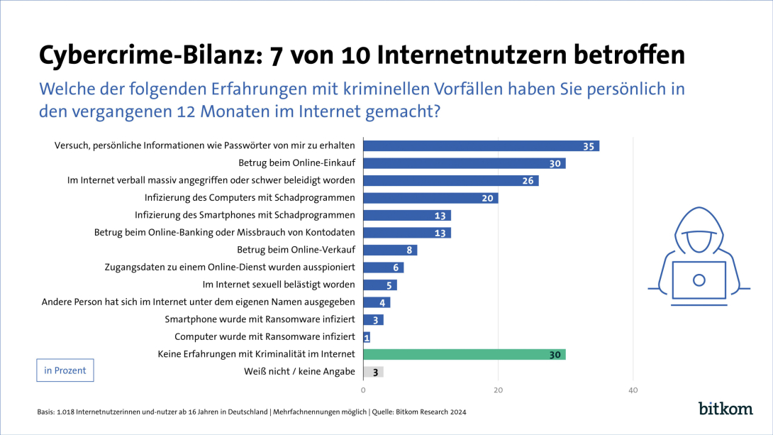 Eine aktuelle Umfrage des Digitalverbands Bitkom zeigt, dass die Cyberkriminalität in Deutschland weiter ein großes Thema ist. Im vergangenen Jahr waren 67 Prozent der Internetnutzerinnen und -nutzer Opfer von Cyberkriminalität. 2022 wurden drei Viertel (75 %) Opfer illegaler Aktivitäten von Cyberkriminellen.