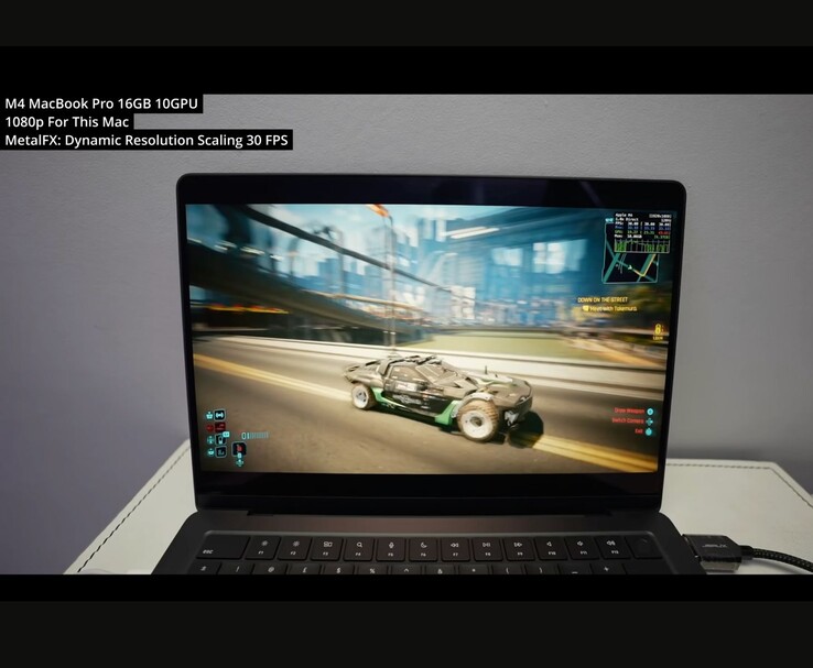 Auf dem regulären Apple M4 Chipsatz im MacBook Pro (ab 1.604 Euro im Preisvergleich) läuft das Spiel standardmäßig mit 30 FPS bei aktivierter dynamischer Skalierung. In diesem Fall ist Cyberpunk 2077 nicht super flüssig, läuft aber stabil. Laut Andrew wird thermisches Throttling dabei vermieden. Wenn das FPS-Limit auf 120 angehoben sowie VSync deaktiviert wird, erreicht man eine Performance von etwa 50-55 FPS. Raytracing bremst das Spiel auf dem MacBook Pro M4 allerdings schnell aus.