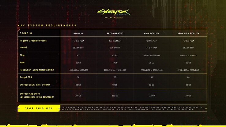 Um das Spiel mit 1.920 x 1.080 Pixel und 60 Bildern pro Sekunde zocken zu können, empfiehlt CD Projekt Red mindestens den Apple M3 Pro. Für eine Auflösung von 2.560 x 1.440 Pixel und eine höhere Grafik-Voreinstellung werden sogar ein Apple M2 Ultra oder aber ein Apple M3 Max vorausgesetzt, dieselbe Auflösung mit "sehr hohen" Grafikeinstellungen erfordert einen Apple M3 Ultra oder einen Apple M4 Max. Das Spiel bietet in jedem Fall eine Voreinstellung, die "Für diesen Mac" genannt wird, welche die optimalen Einstellungen auf Basis des verbauten Prozessors automatisch auswählen soll.