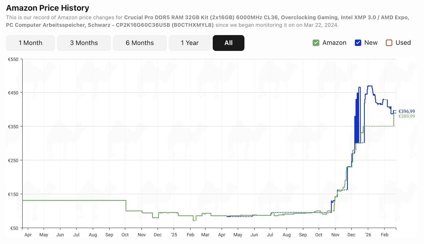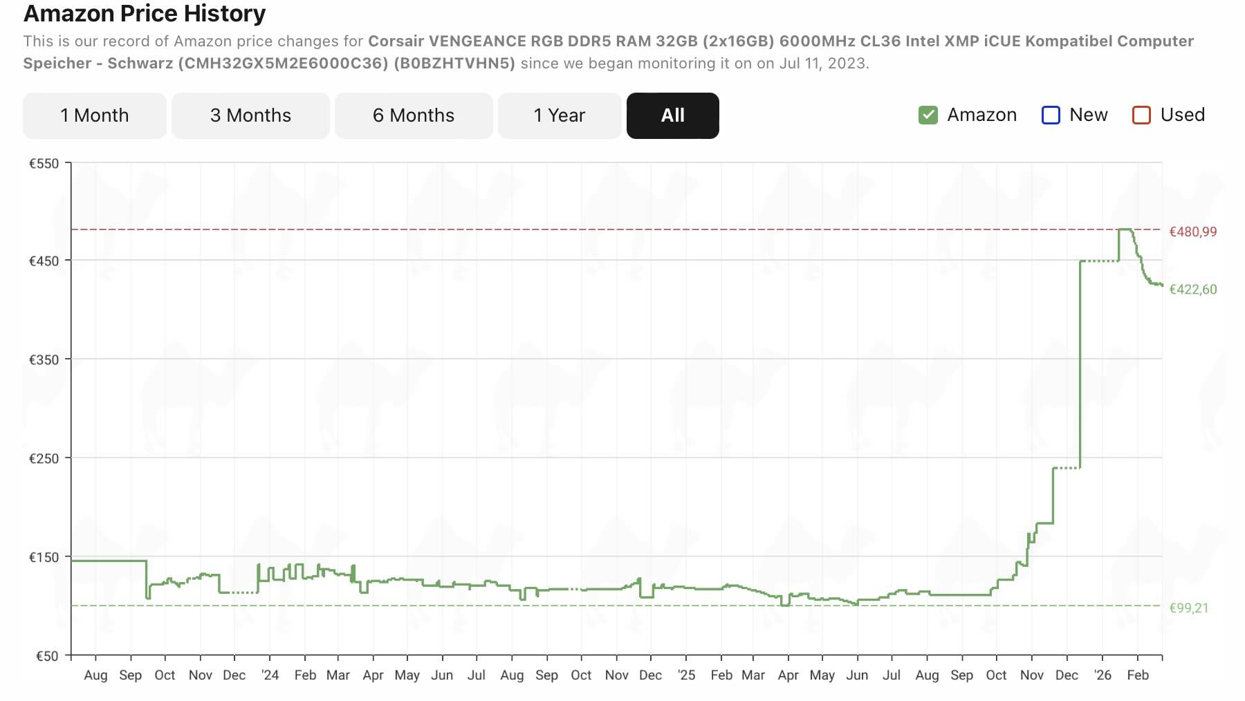 Wie der zuverlässige Amazon-DE-Preis-Tracker Camelcamelcamel zeigt, sind die Preise für DDR5-Speicherkits von bekannten Herstellern wie Patriot, Crucial, Kingston und Corsair im Vergleich zu ihren Höchstständen im Januar deutlich gefallen – liegen allerdings weiterhin klar über dem Niveau des vergangenen Jahres.