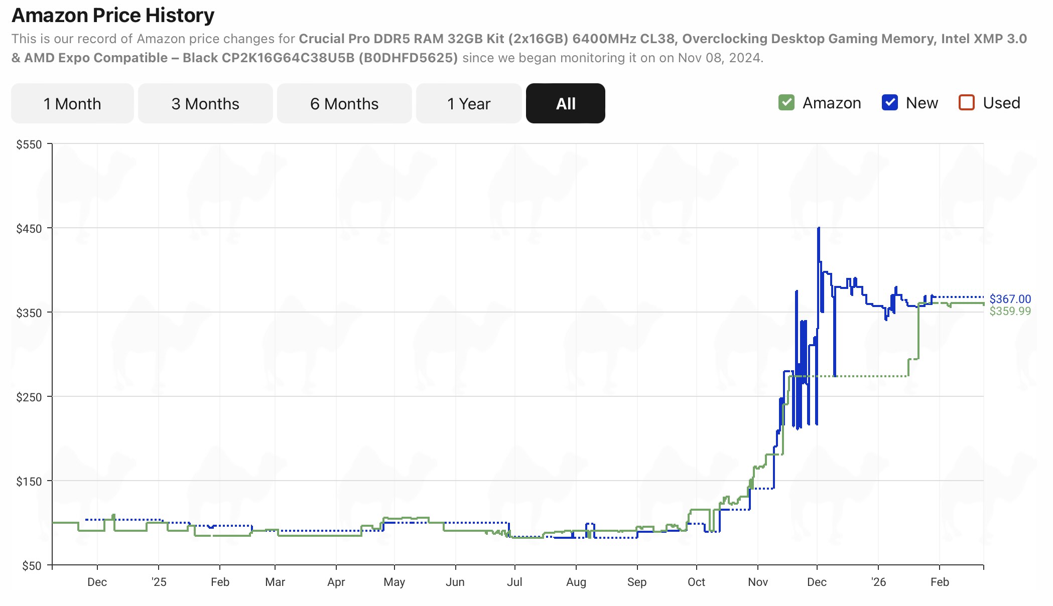 Angesichts der aktuellen Marktlage dürfte selbst ein moderater Preisrückgang vielen Gamern bereits etwas Luft verschaffen. So listet Amazon das 32-GB-DDR5-6400-Kit von Crucial in den USA derzeit für rund 360 US-Dollar. Interessant ist zudem, dass sich die Preise dort im Vergleich zu den Allzeithochs im Dezember 2025 ebenfalls spürbar stabilisiert haben.