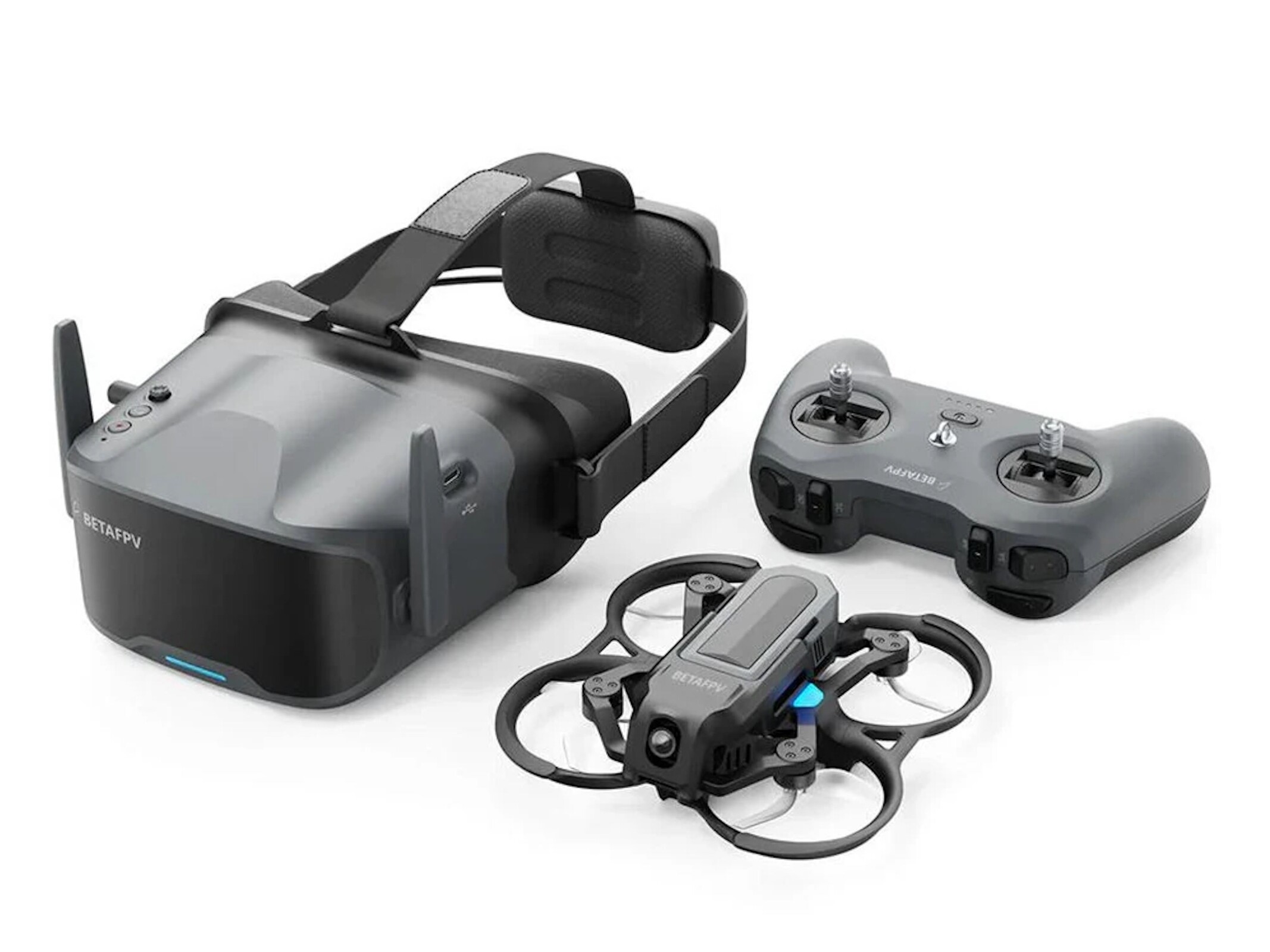 Für die Steuerung steht ein Controller bereit, wobei dieser einem typischem Game-Controller nicht ganz unähnlich ist, allerdings gibt es keine Analogsticks. Angegeben wird eine Flugzeit von 10 Minuten, die maximale Geschwindigkeit wird mit 18 km/h angegeben. Angegeben wird ein Startgewicht von 122 Gramm, über die genauen, rechtlichen Rahmenbedingungen sollten sich Nutzer aber natürlich trotzdem genau informieren. Im Lieferumfang sind alle nötigen Teile bereits enthalten, also unter anderem die Drohne, die FPV-Brille, Akku und Ladegerät und auch ein USB-Kabel.