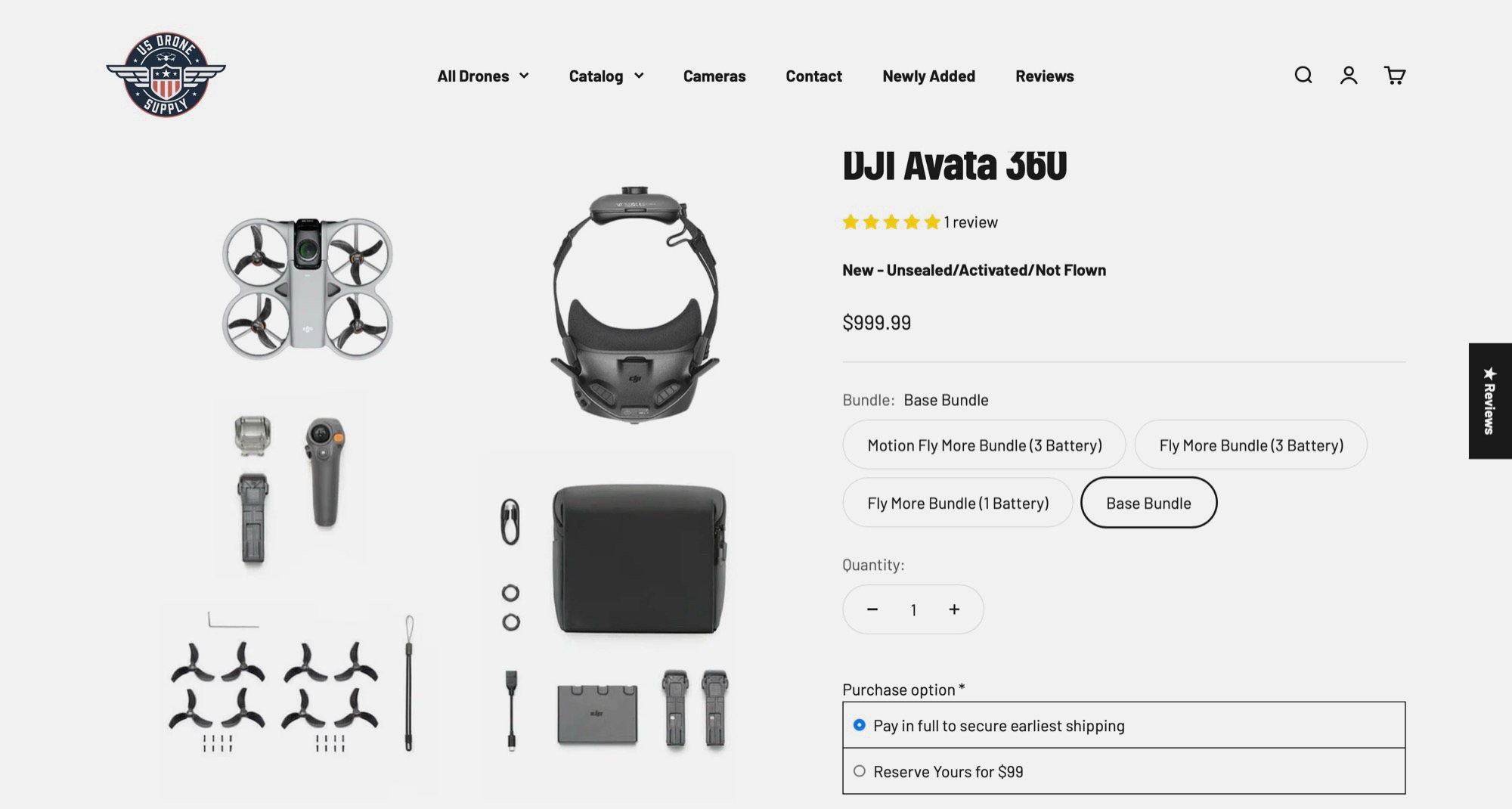Die DJI Avata 360 dürfte schon in Kürze auf den Markt kommen, denn der US-Onlineshop US Drone Supply listet die Drohne bereits in vier Paketen. Wenn die Preise des Händlers final sind, wird die Drohne deutlich teurer als erwartet. Denn das "Base"-Bundle, das lediglich die Drohne und einen Akku enthält, kostet schon 999 US-Dollar.