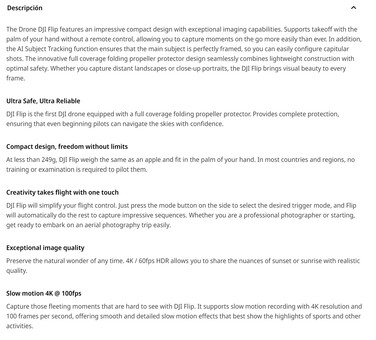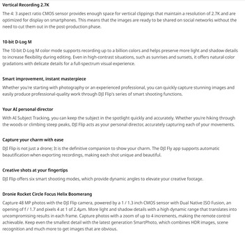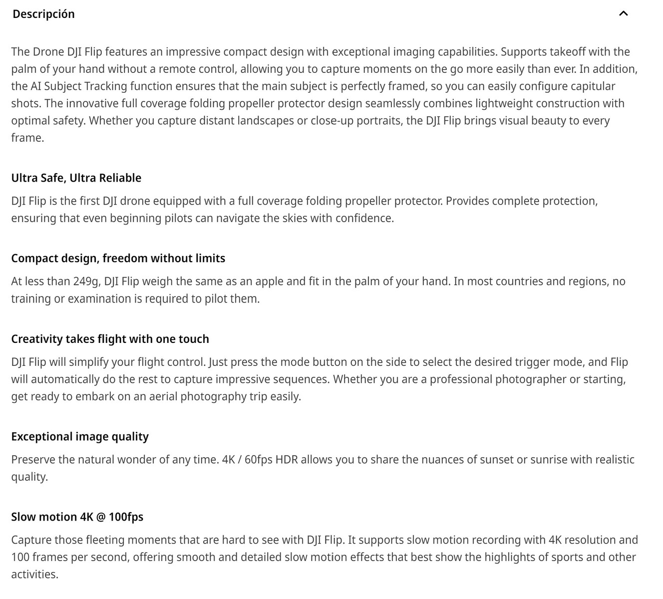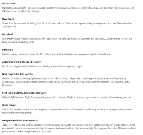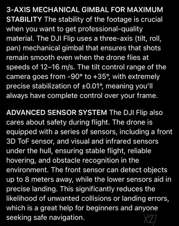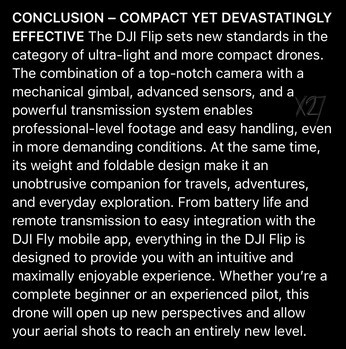 Die Händler lieferten netterweise nicht nur die bereits bekannten Bilder und Preise sondern auch gleich offizielle Beschreibungen sowie Datenblätter, hier etwa jene von Mediamarkt. Vieles davon dürfte LeserInnen von Notebookcheck bereits aus früheren Leaks bekannt sein, es verbergen sich allerdings auch einige neue Informationen in den Promotexten. So wird etwa konkret der 3D-TOF-Sensor angesprochen, der bei Nachtflügen hilfreich sein soll. Auch Panorama-Aufnahmen, vertikales Filmen sowie MasterShots und Hyperlapse-Videos werden unterstützt. Laut Mediamarkt Spanien wird die DJI Flip zwischen dem 20. Januar und 22. Januar 2025 verfügbar sein.