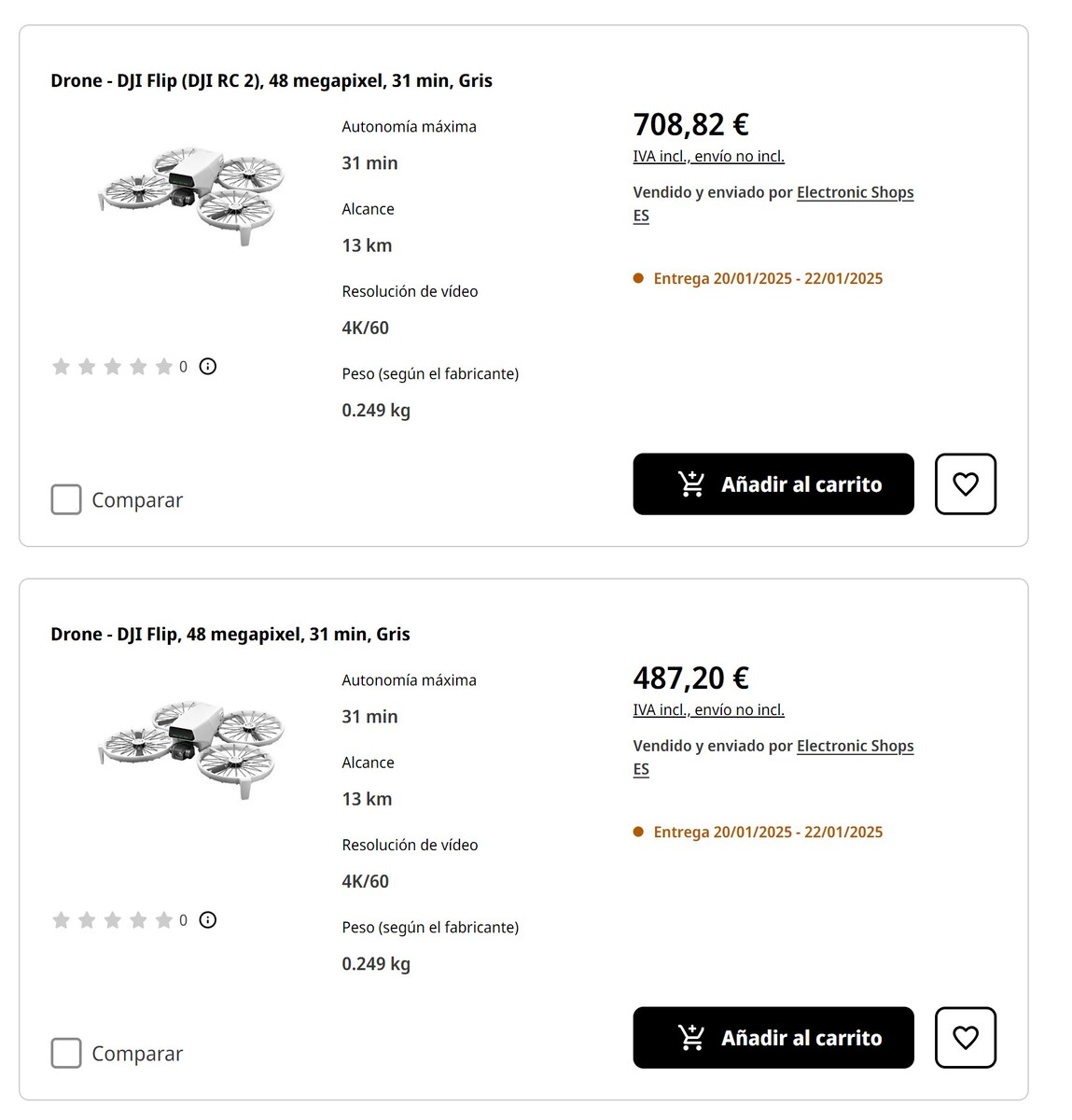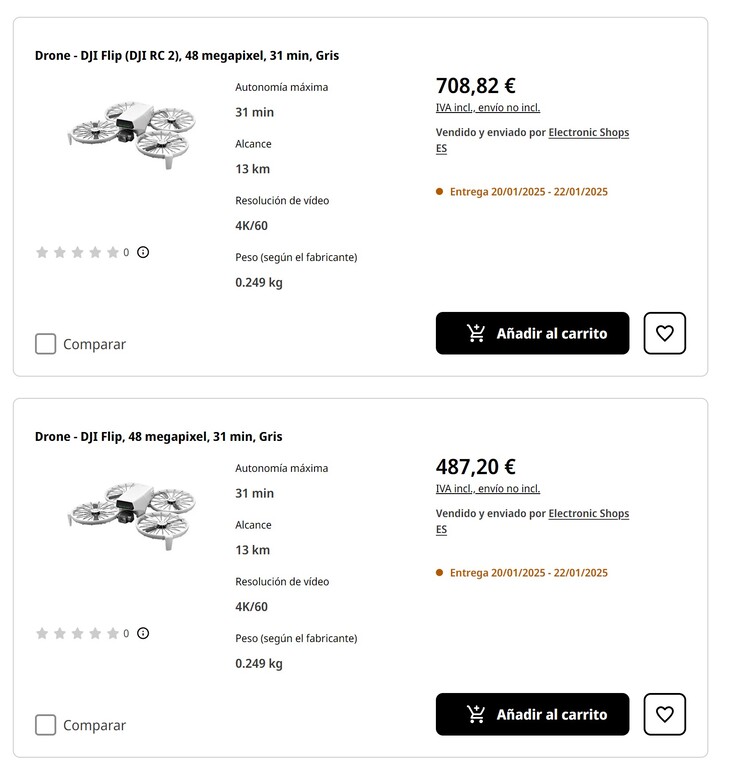 Am Dienstag dem 14. Januar hebt die DJI Flip offiziell ab, wie vergangene Woche ein erster offizieller Teaser verraten hat. Schon jetzt findet man sie allerdings in diversen Onlineshops einiger Händler, etwa auch bei Mediamarkt in Spanien, wie wir uns dieses Wochenende selbst überzeugen konnten. Die Screenshots unten zeigen zwei Pakete für 487 Euro und 708 Euro. Ein von Jasper Ellens entdeckter kroatischer Webshop nennt als Preise 449 Euro, 659 Euro sowie 809 Euro, das ist also in etwa auf dem Niveau der bereits vor einigen Wochen aus Frankreich geleakten Infos.