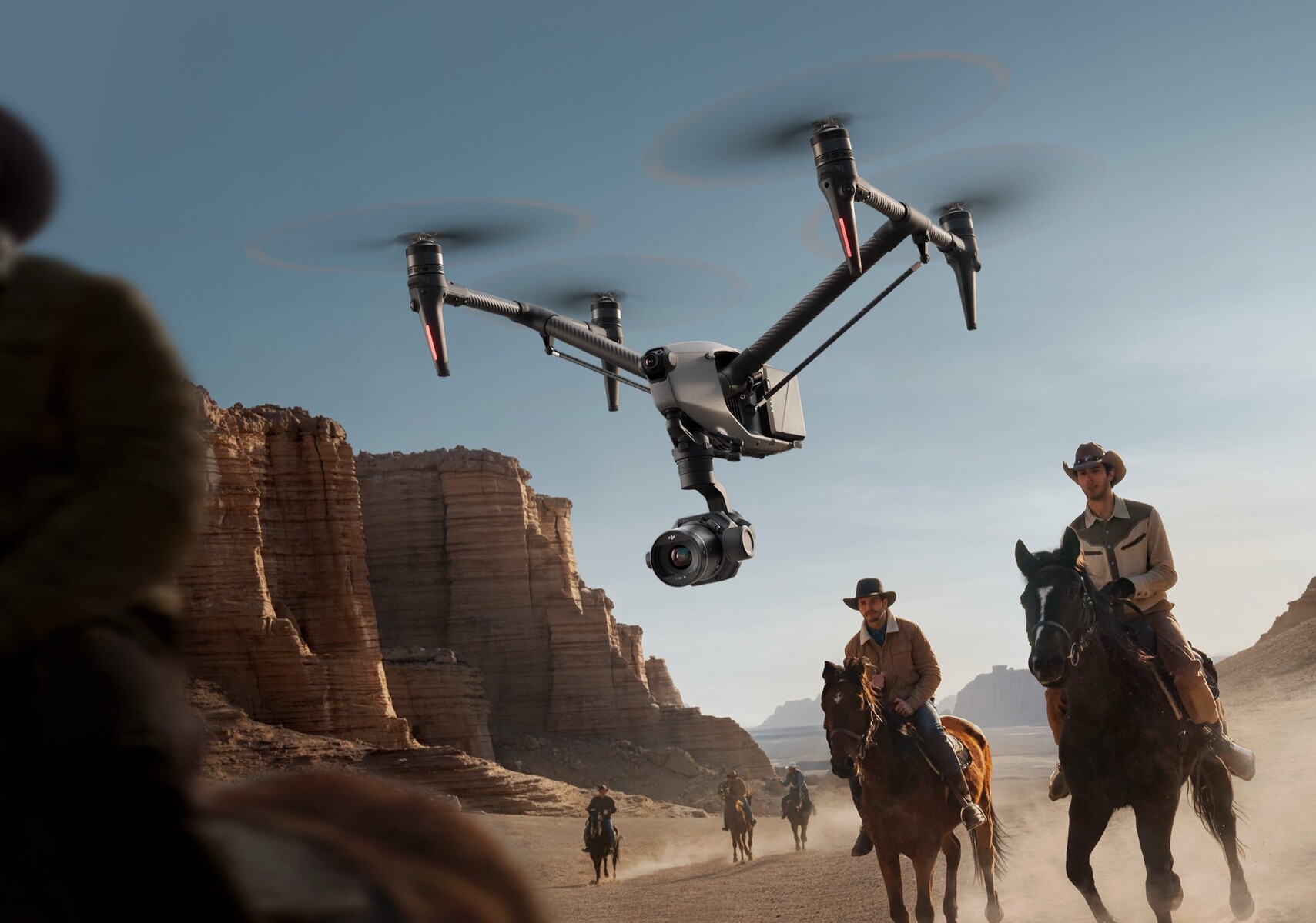 Zusätzlich verbaut DJI eine Nachtsicht-FPV-Kamera mit einem Sensor im 1/1,8 Zoll Format und einem Sichtfeld von 161 Grad, die 4K-Videos aufzeichnen oder 1.080p-Videos in Echtzeit an die Fernsteuerung oder an eine kompatible Videobrille übertragen kann. Die Inspire 3 wird mit einer DJI RC Plus Fernsteuerung mit integriertem 7 Zoll 1.200 Nits Display, 15 Kilometern Reichweite, HDMI-Ausgang und 3,3 Stunden Akkulaufzeit ausgeliefert. DJI liefert außerdem ein 1 TB SSD-Modul mit, das Datenraten bis 900 MB/s erreicht. Die SSD kann jederzeit durch eine einfache Klappe getauscht werden.