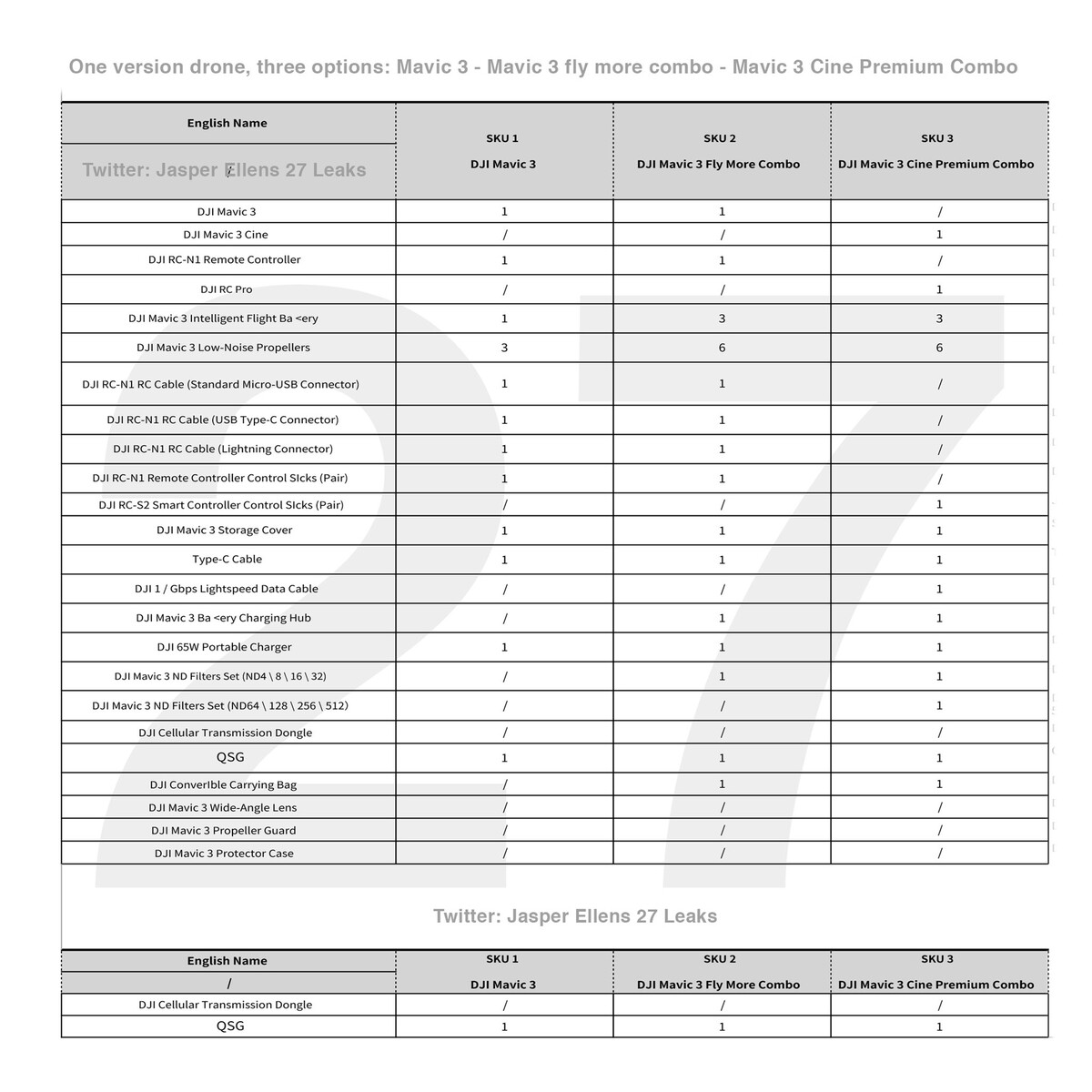 Ebenfalls in den letzten Stunden geleakt sind Details zu den geplanten Optionen und Kombopaketen. Spannend ist etwa auch eine Weitwinkel-Optik, die möglicherweise als Addon-Lens erhältlich sein wird. Aus aktueller Sicht scheint es eine DJI Mavic 3 und eine DJI Mavic 3 Cine zu geben letztere könnte also die Pro-Version werden. Unten auch noch der Hinweis von Jasper Ellens, dass der kolportierte Preis von 1.600 US-Dollar vermutlich nur für die Drohne selbst gilt, die Basisvariante dürfte mit dem Standard-Controller ausgeliefert werden. Erst die DJI Mavic 3 Cine hat wohl den Smart Controller 2.0 im Paket.