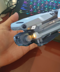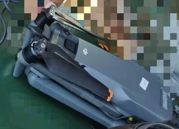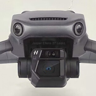 Die Bilder oben und unten zeigen uns die neue Prosumer-Drohne DJI Mavic 3 aus nächster Nähe wobei die Versionsnummer 3 provisorisch abgeklebt wurde. Die Nachfolger der DJI Mavic 2 Pro (hier bei Amazon erhältlich) und DJI Mavic 2 Zoom haben eine neue Hasselblad Dualcam mit Telefoto-Kamera an Bord, gut erkennbar sind auch die beiden im 45 Grad-Winkel angeordneten Obstacle-Avoidance-Sensoren an der Front, die auch Hindernisse an den Seiten erkennen sollen. Rund um die Drohne herum sind großflächige Lüftungsschlitze und Kühlkörper angebracht.