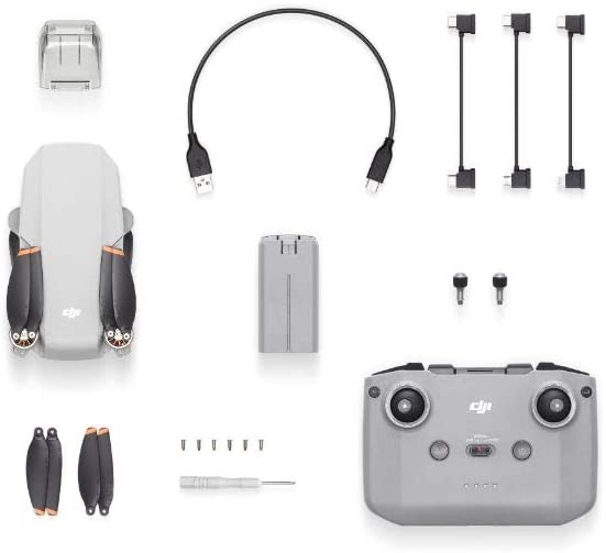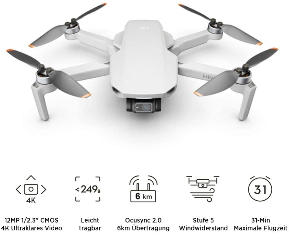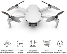Die Übertragungsreichweite liegt bei bis zu 10 km, die Flugzeit der DJI Mini 2 bei bis zu 31 Minuten. Es handelt sich bei der angebotenen Version nicht um das deutlich teurere Fly More Combo, das für gut 580 Euro bei Amazon erhältlich ist. Somit liegen nicht mehrere Akkus, sondern nur ein Akku, die Funkfernsteuerung mit OcuSync 2.0 HD-Videoübertragung sowie etwas Zubehör wie ein Ersatzpropeller und die notwendigen Kabel der Drohne bei.