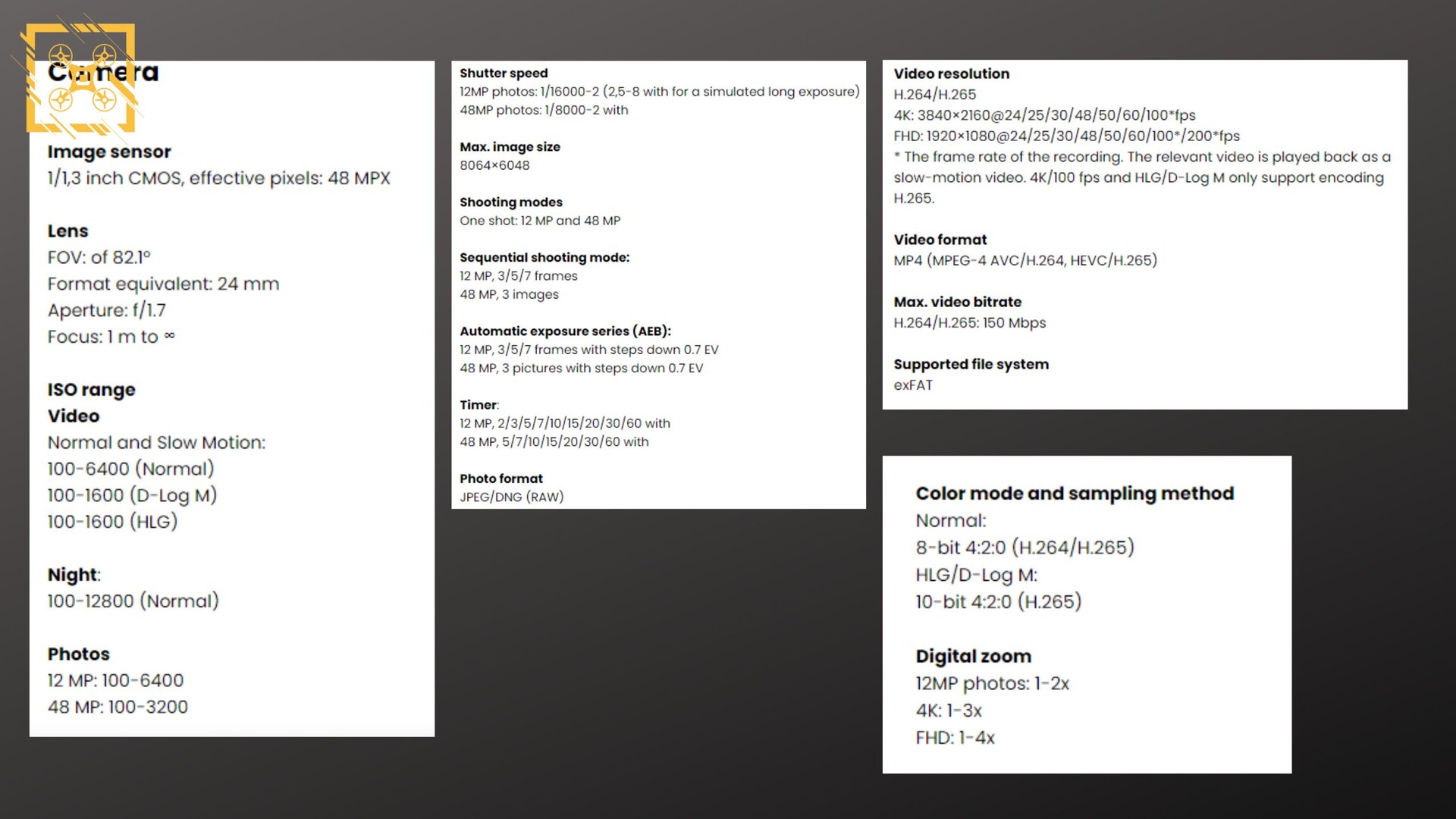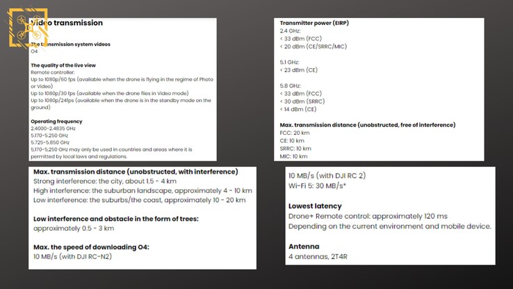 Dank @Quadro_News werden wir nun auch noch am Tag vor dem Launch mit Auszügen aus dem detaillierten Datenblatt belohnt. Wer also noch vor den offiziellen Infos ins Detail abgleiten will, kann unten alles zum OcuSync 4 System, zur 360 Grad Hinderniserkennung, zur Kamera und zum Standard-Akku erfahren.