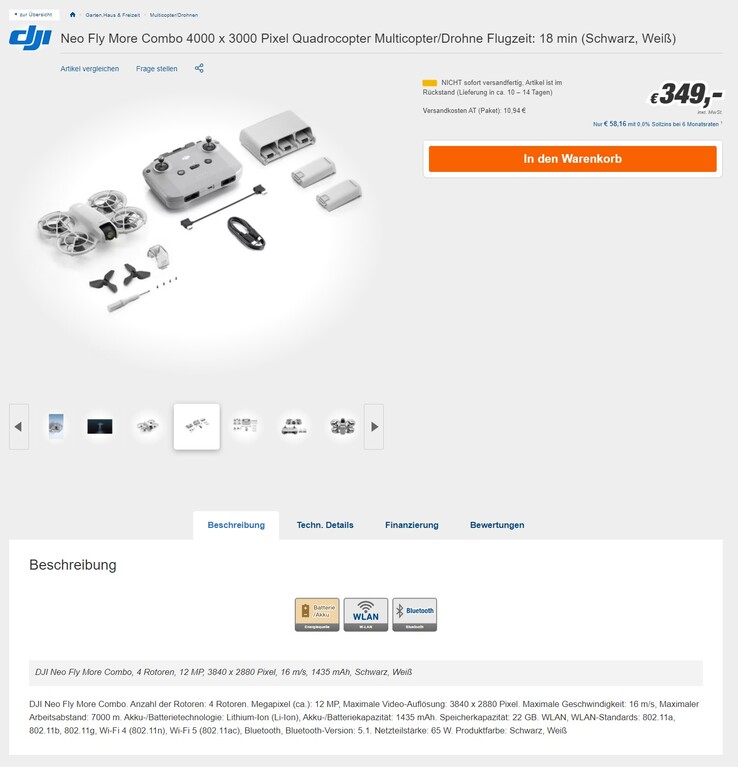 Auch ein zweiter bekannter deutscher Händler hat das Drohnen-Einstiegspaket um 199 Euro bereits im Shop gelistet und auch ein übersichtliches Datenblatt anzubieten, das allerdings nichts verrät, was nicht bereits in früheren Leaks bekannt wurde, nun halt sozusagen offiziell bestätigt.