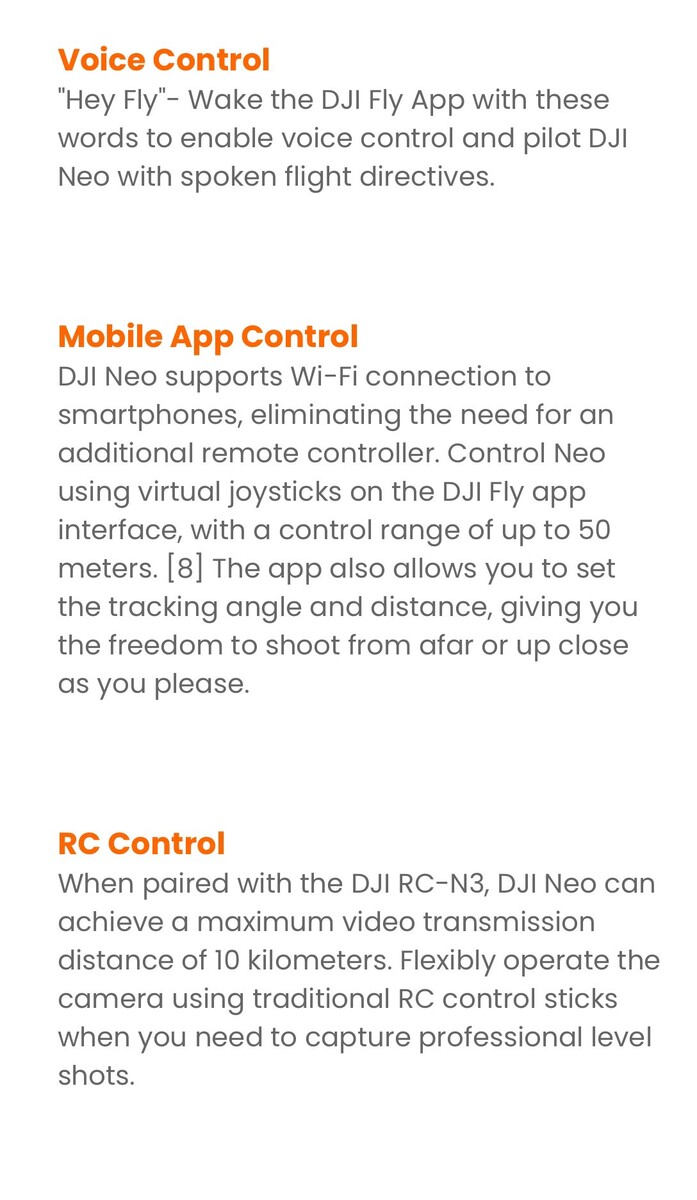 - Steuerung über die DJI Fly App, via WiFi im Bereich von maximal 50 Metern, auch mit Sprachbefehlen wie "Hey Fly"