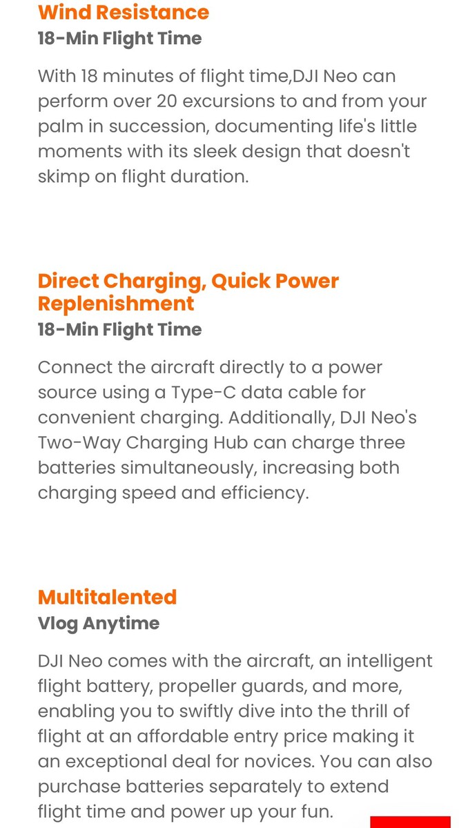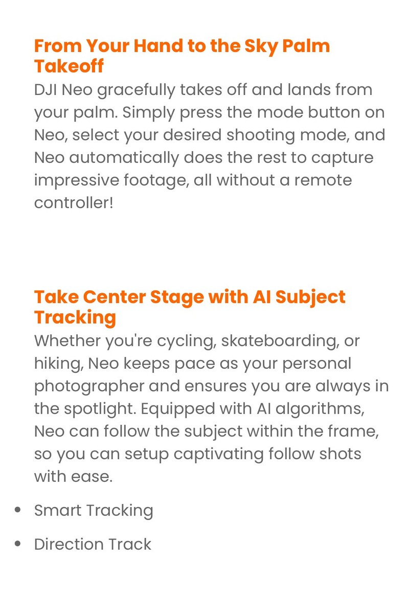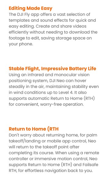 Darin findet sich nicht nur der potentielle Preis der neuen DJI-Drohne sondern auch eine umfassende Liste aller Features und Funktionen. Hierbei werden auch Features angesprochen, die im Datenblatt-Leak vor wenigen Tagen noch nicht zu finden waren, etwa die Nutzung in Innenräumen, die vielfältigen Steuerungsmöglichkeiten, die jüngst auch Thema eines separaten Leaks waren sowie die Nennung eines Ein-Achsen-Gimbals. Konkret wird die nur 135 Gramm leichte DJI Neo laut Promo-Material unten folgende Features bieten: