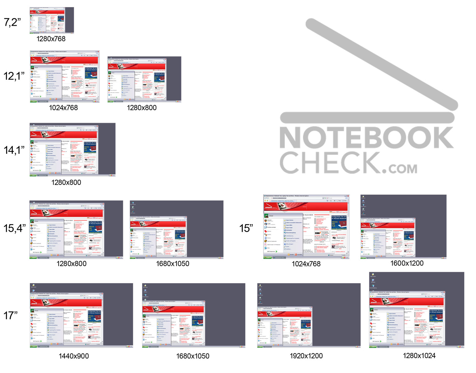 Folgende Illustration zeigt die relative Displaygröße zueinander und wie viel "Platz" am Bildschirm bei Windows XP (bei den standardmäßig eingestellten 96 DPI) bleibt.