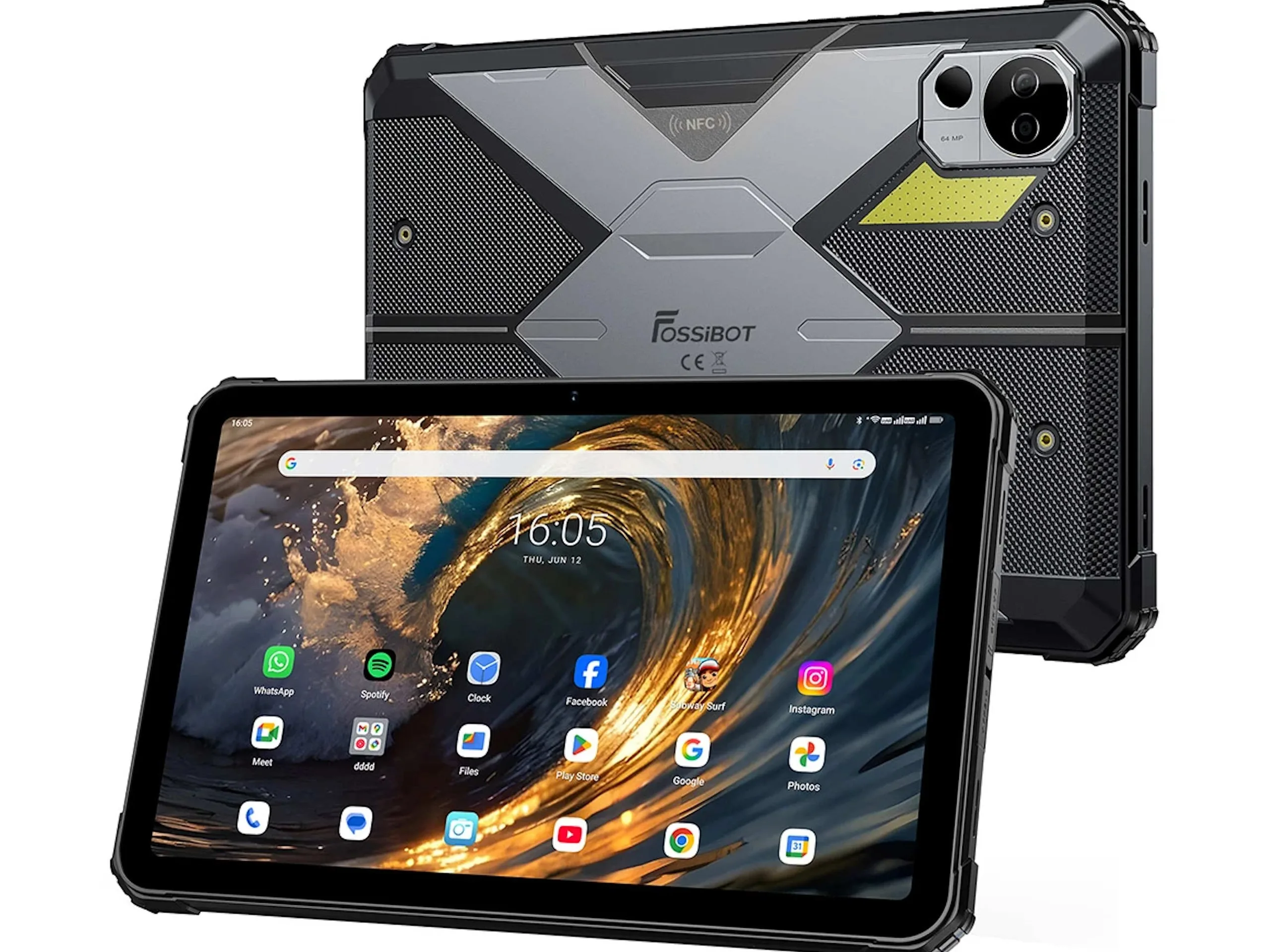 Das Display misst in der Diagonalen und löst mit 1.200 x 2.000 Pixeln auf, angegeben wird eine Spitzenhelligkeit von 500 cd/m² und eine typische Helligkeit von 400 cd/m². Das Tablet entspricht Herstellerangaben zufolge den Anforderungen der IP68, IP69K und MIL-STD-810H und dürfte damit von eindringendem Staub, eindringenden Wasser und auch Stürzen nicht beschädigt werden. Verbaut ist ein GNSS-Modul unter anderem mit GPS-, Glonass- und Galileo-Support, die Nutzung als Navigationssystem ist damit - dank des Mobilfunkmodems dann auch ohne Smartphone-Hotspot mit aktuellen Verkehrsdaten - denkbar. NFC und ein Fingerabdrucksensor sind vorhanden. Es sind vier Lautsprecher verbaut, auf der Rückseite befindet sich eine stärkere Taschenlampe, verbaut ist eine mit 64 Megapixeln auflösende Hauptkamera, dazu kommt noch eine Frontkamera mit 32 Megapixeln.