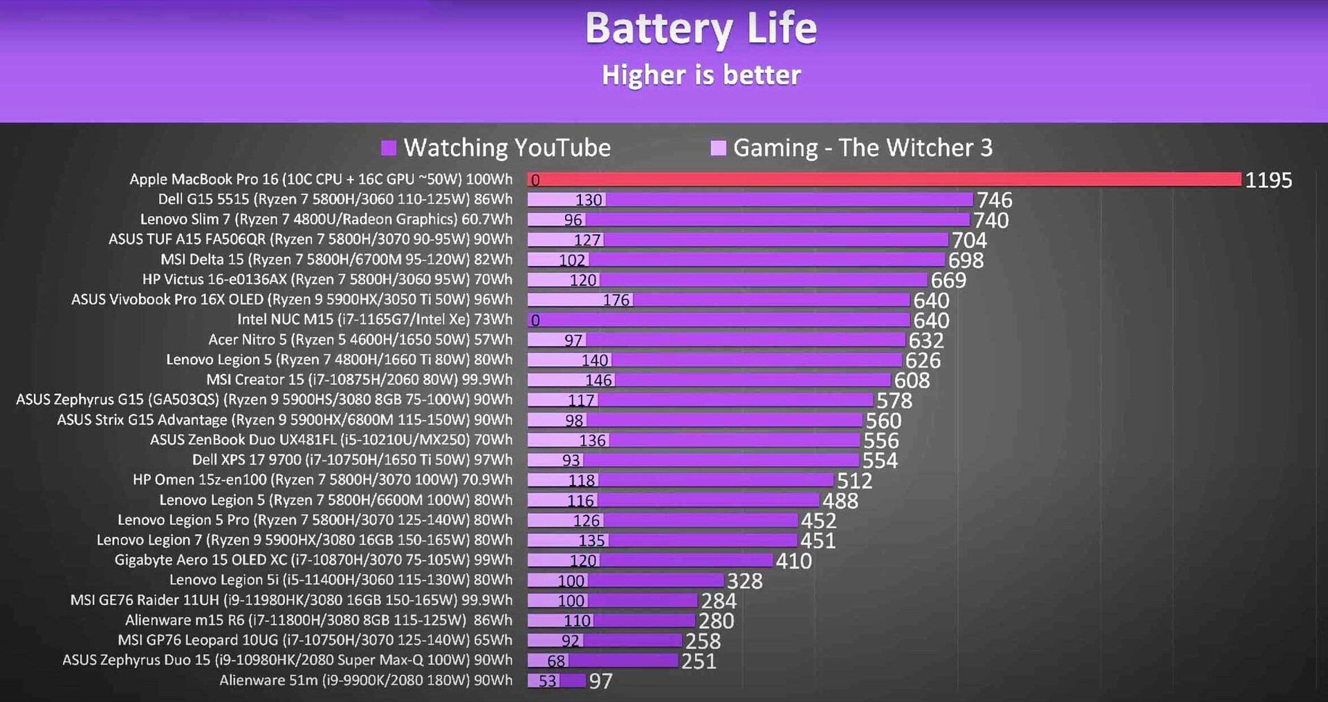Das Dell G15 5515 mit dem AMD Ryzen 7 5800H und einem 86 Wh fassenden Akku konnte den zweiten Platz ergattern, mit einer Laufzeit von 12,4 Stunden läuft das MacBook Pro unter denselben Bedingungen aber beeindruckende 60 Prozent länger. Dieses Ergebnis deckt sich mit unserem ausführlichen Test, in dem das MacBook Pro durch den sparsamen Prozessor und den 100 Wh großen Akku beim Surfen im Web beachtliche 17 Stunden lang durchgehalten hat, 5 Stunden länger als das direkte Vorgängermodell.
