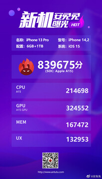 AnTuTu hat das unten eingebettete Benchmark-Ergebnis auf Weibo geteilt. Dabei wurde ein iPhone 13 Pro mit 6 GB Arbeitsspeicher und mit 1 TB Flash-Speicher getestet, das mithilfe des brandneuen Apple A15 Bionic ein beachtliches Ergebnis von 839.675 Punkten erreicht. Zum Vergleich: Das Apple iPhone 12 Pro (ca. 1.050 Euro auf Amazon) kam auf insgesamt 705.725 Punkte, das neue Flaggschiff ist laut AnTuTu also rund 19 Prozent schneller.