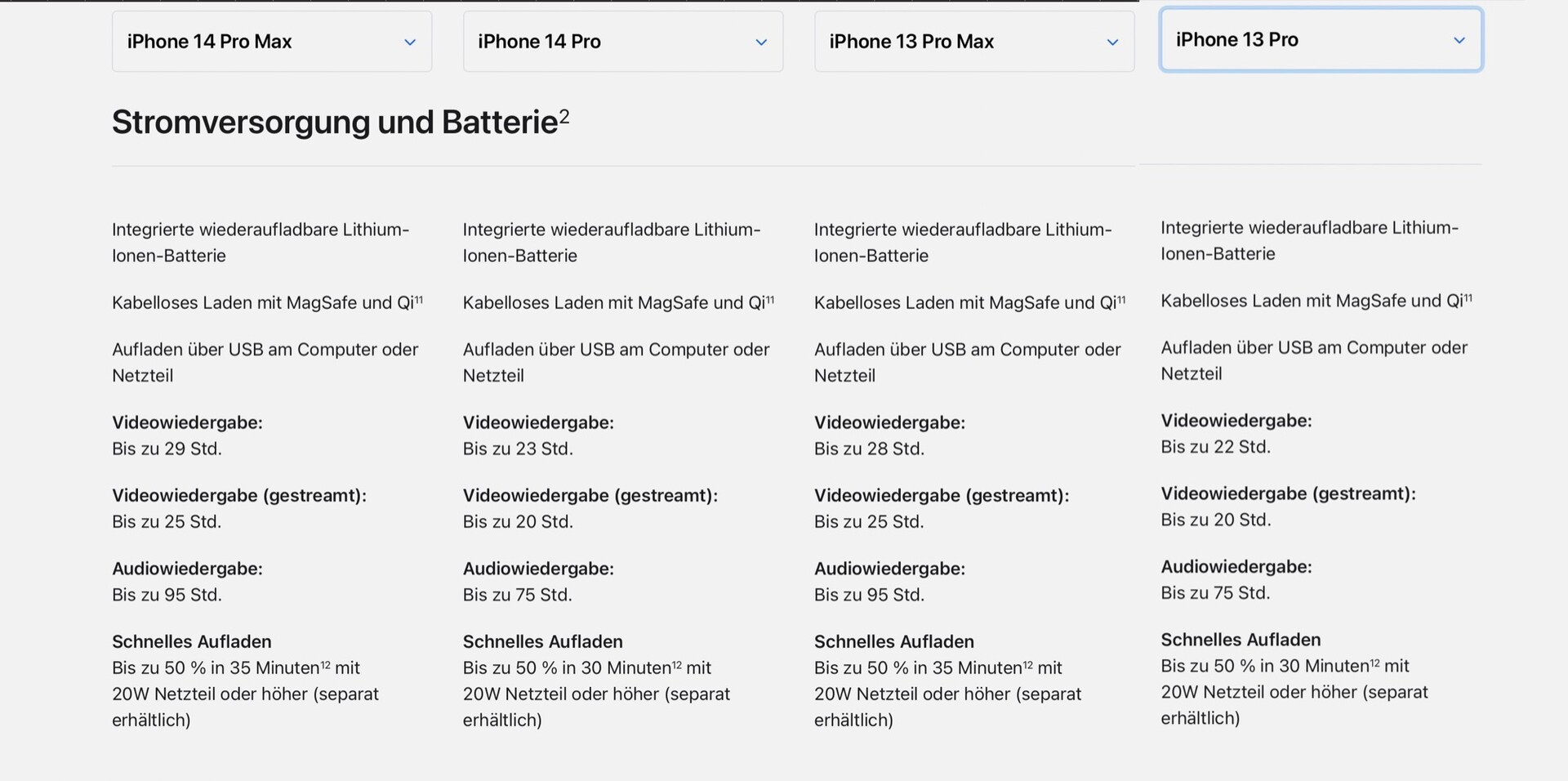 Laut Apples technischer Daten halten alle Modelle der iPhone 14-Serie beim Anschauen von Videos eine Stunde länger durch als ihre Vorgänger. Während es beim Video-Streaming und beim Abspielen von Musik bei den beiden Pro-Modellen keinerlei Fortschritte gibt, hält das iPhone 14 auch in diesen Disziplinen etwas länger als noch das iPhone 13. Der Apple A16 Bionic des iPhone 14 Pro sollte durch die modernere Fertigung in TSMCs N4-Verfahren effizienter arbeiten, ob die Laufzeit der Pro-Modelle dadurch in der Praxis spürbar länger ausfällt, werden aber erst ausführlichere Tests zeigen.
