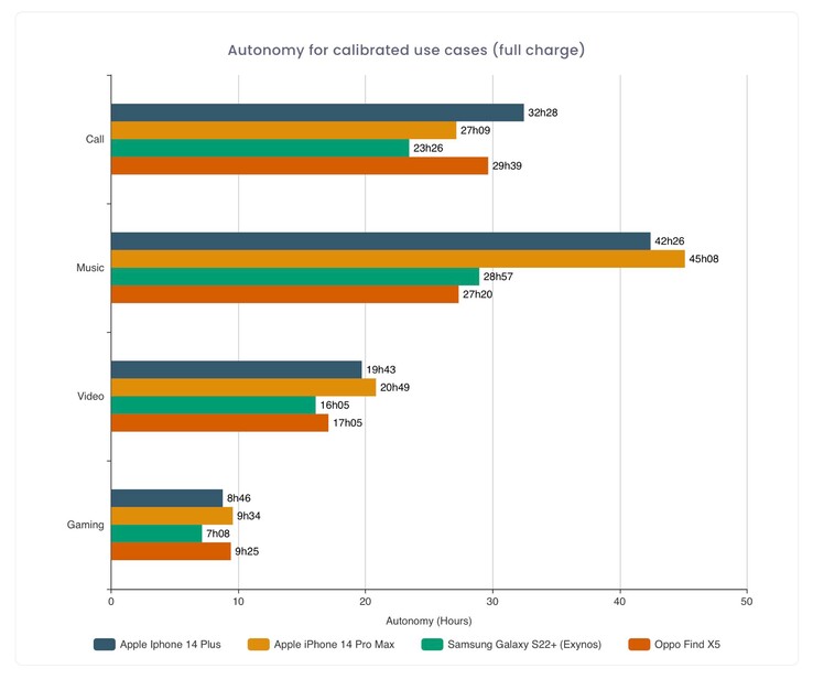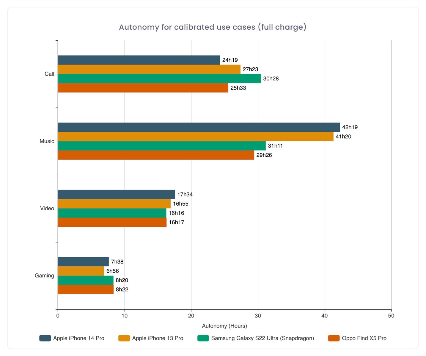 Der vergleichsweise kleine 3.200 mAh Akku macht sich vor allem bei aufwändigeren Anwendungsszenarien bemerkbar, beim Gaming läuft Apples Flaggschiff beispielsweise nur 07:38 Stunden, das Samsung Galaxy S22 Ultra hält 42 Minuten länger durch. Der Apple A16 Bionic zeigt sich beim Musik-Streaming oder auch bei der Nutzung von Social-Media-Apps aber ausgesprochen effizient.