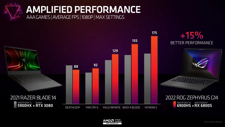 Um diesen Preis zu rechtfertigen hat Asus den unten eingebetteten Benchmark-Vergleich geteilt, laut dem das ROG Zephyrus G14 die Leistung des Topmodells des Razer Blade 14 vom Vorjahr übertreffen kann, obwohl Razer auf einen Ryzen 9 5900HX und auf eine Nvidia GeForce RTX 3080 Laptop-GPU zurückgreift.
