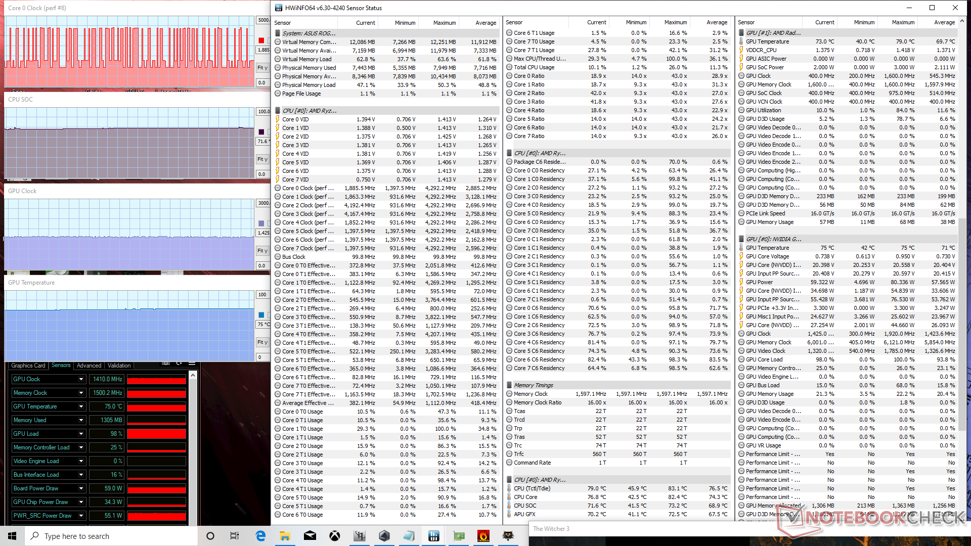 Beim Spielen von The Witcher 3 stabilisieren sich die CPU- und GPU-Temperaturen bei 77 °C und 75 °C, verglichen mit den nur leicht niedrigeren 74 °C und 71 °C im Vorgänger.